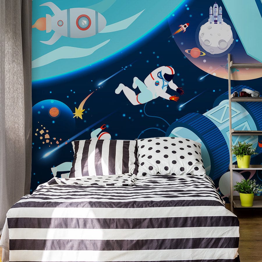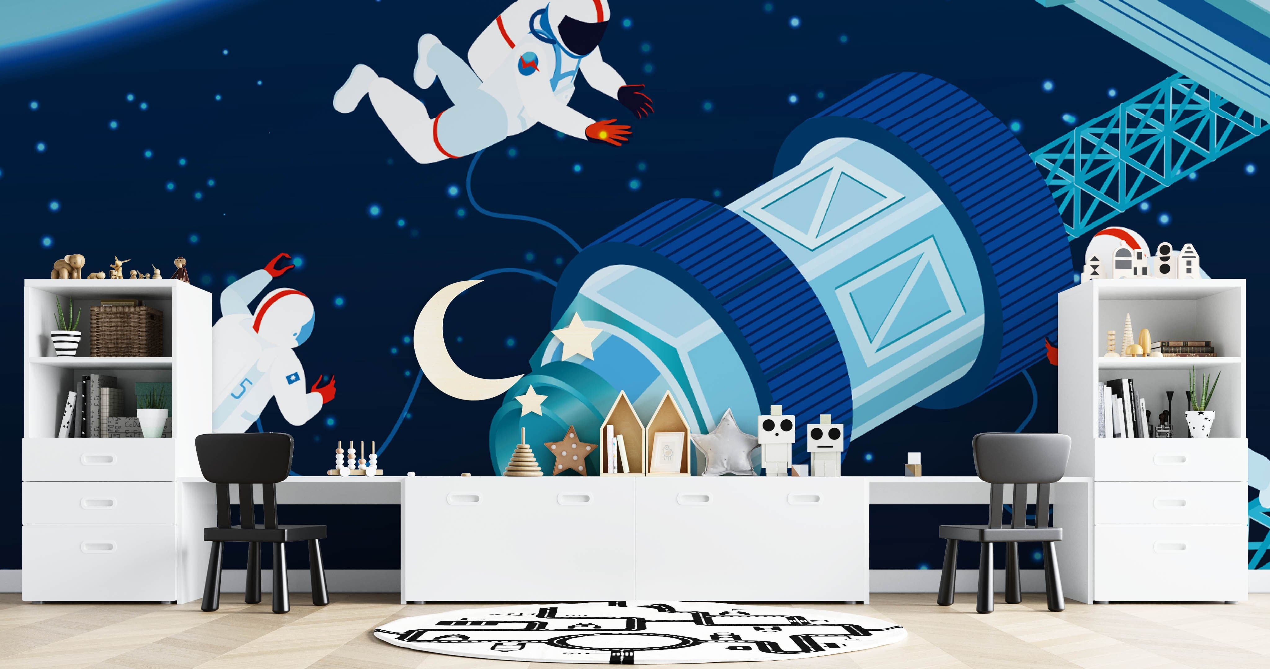 Embrace an interstellar escape with this captivating Space Station Wallpaper Mural, where vibrant astronauts float amongst distant planets and a majestic space station. The intricate details evoke a sense of wonder and adventure, making it an exquisite choice for any room. Its sophisticated design invites a timeless journey through the cosmos, seamlessly fitting into a range of interiors while providing an inspiring backdrop.