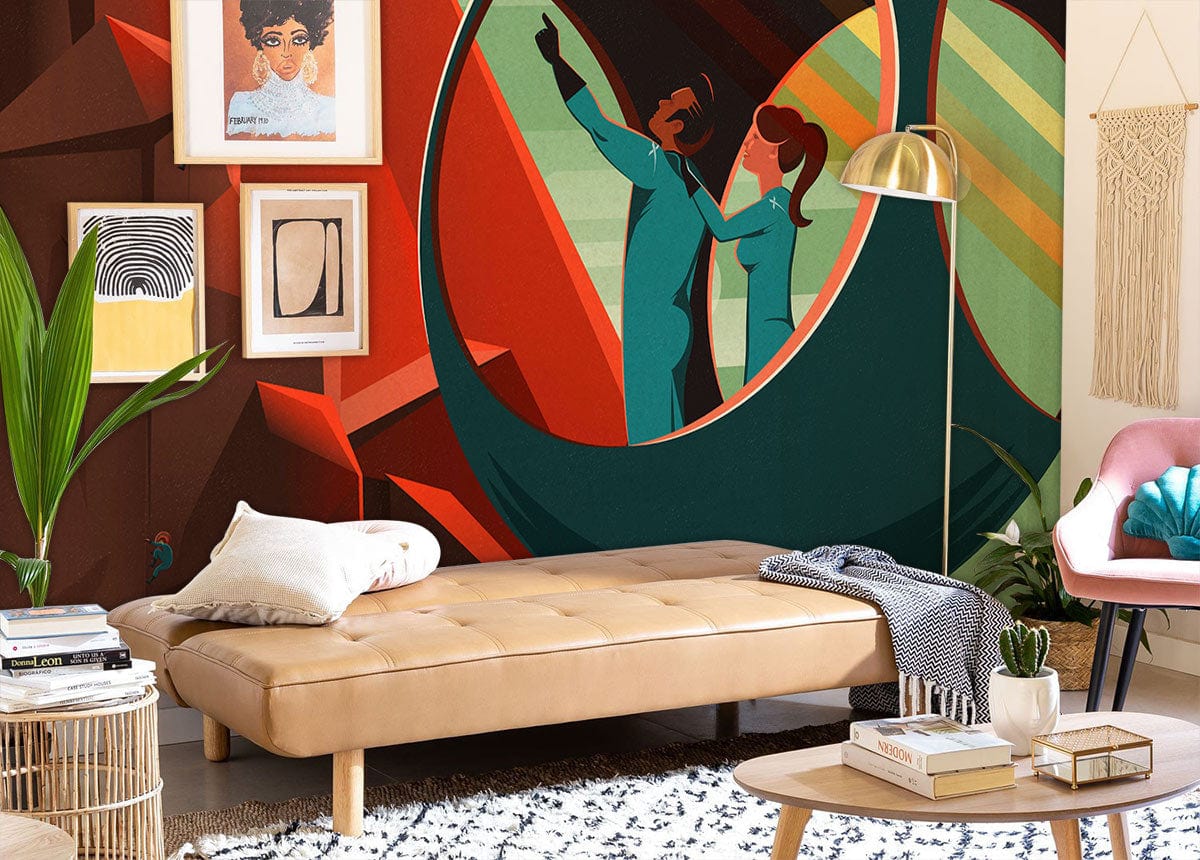 Inventions and technology are in our daily life with no doubt. This mural wallpaper with abstracted module of painting is one of the pieces that you have to put in your list if you are looking for a cool, modern design. This wallpaper mural is perfect for your book store decoration, living room, office or your working space. The wallpaper shows a couple of a man and a woman who are discussing something and pointing out to something really matters. The technology and the reality in the mural will add really detailed effect at your space. Style it with chiffon plain white curtains, and wooden modern furnishing for the perfect results.