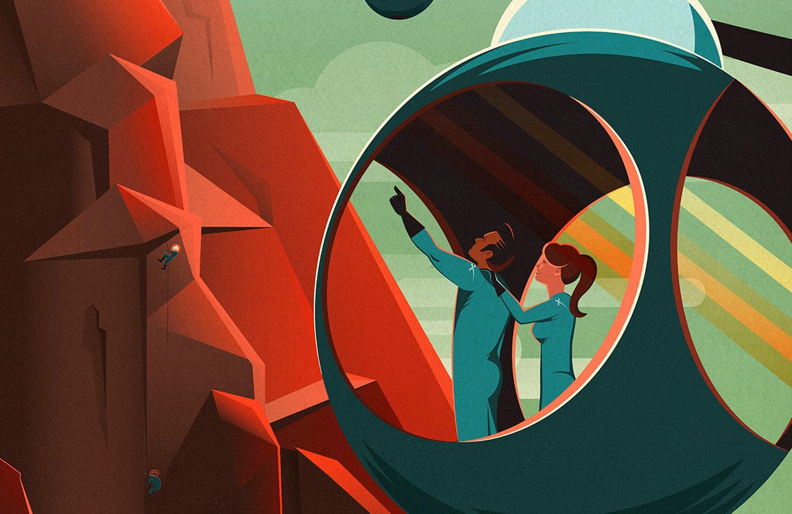 Marvel at the captivating charm of this Space Travel Poster Wallpaper Mural, where retro-futuristic design meets bold adventure. The artwork features a dynamic interplay of deep reds and soothing greens, encapsulating the spirit of exploration. Its vivid depiction of cosmic travel adds a sense of boundless curiosity and timeless allure, seamlessly complementing a range of interior styles, from vintage-inspired to contemporary settings.