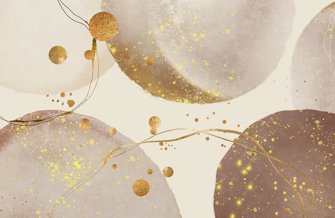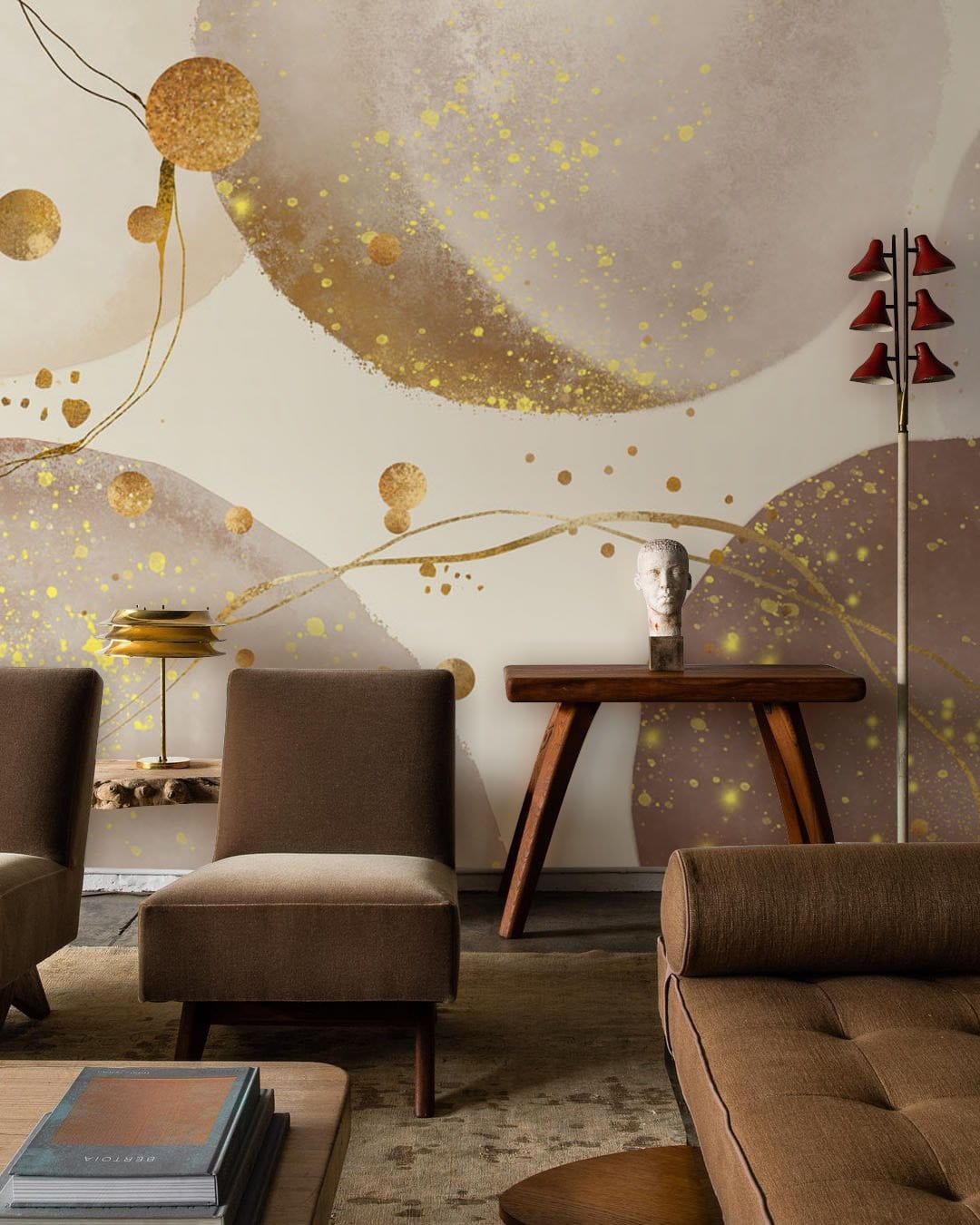 Spheritis Wallpaper Mural offers a captivating blend of organic shapes and metallic accents. The design marries soft, muted tones with splashes of gold, creating a sophisticated and dynamic ambience. Its fluid geometry and subtle textures evoke a sense of modern elegance, effortlessly complementing diverse interior styles.