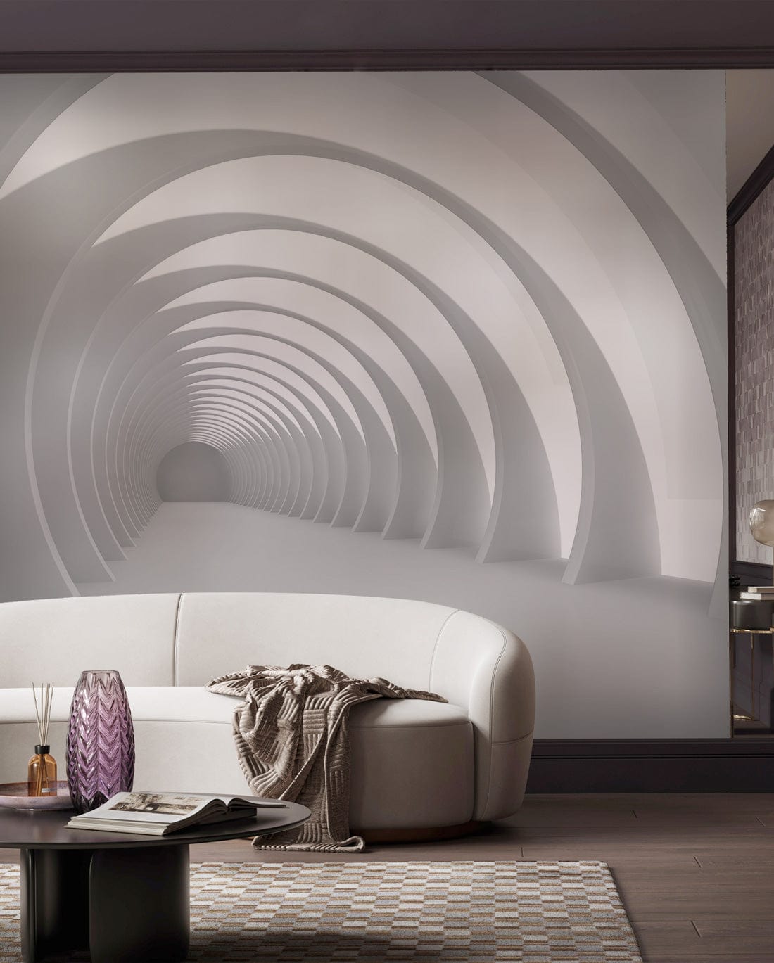 Step into a realm of visual intrigue with the Spiral Archway Illusion Mural Wallpaper. This exquisite design features elegantly curved arches creating a striking optical illusion, drawing you deeper into its endless perspective. Subtle shades of grey and white harmonise to produce a sophisticated ambience, offering a timeless allure. Perfectly suited to contemporary and minimalist interiors, this mural serves as a stunning focal point in any setting.