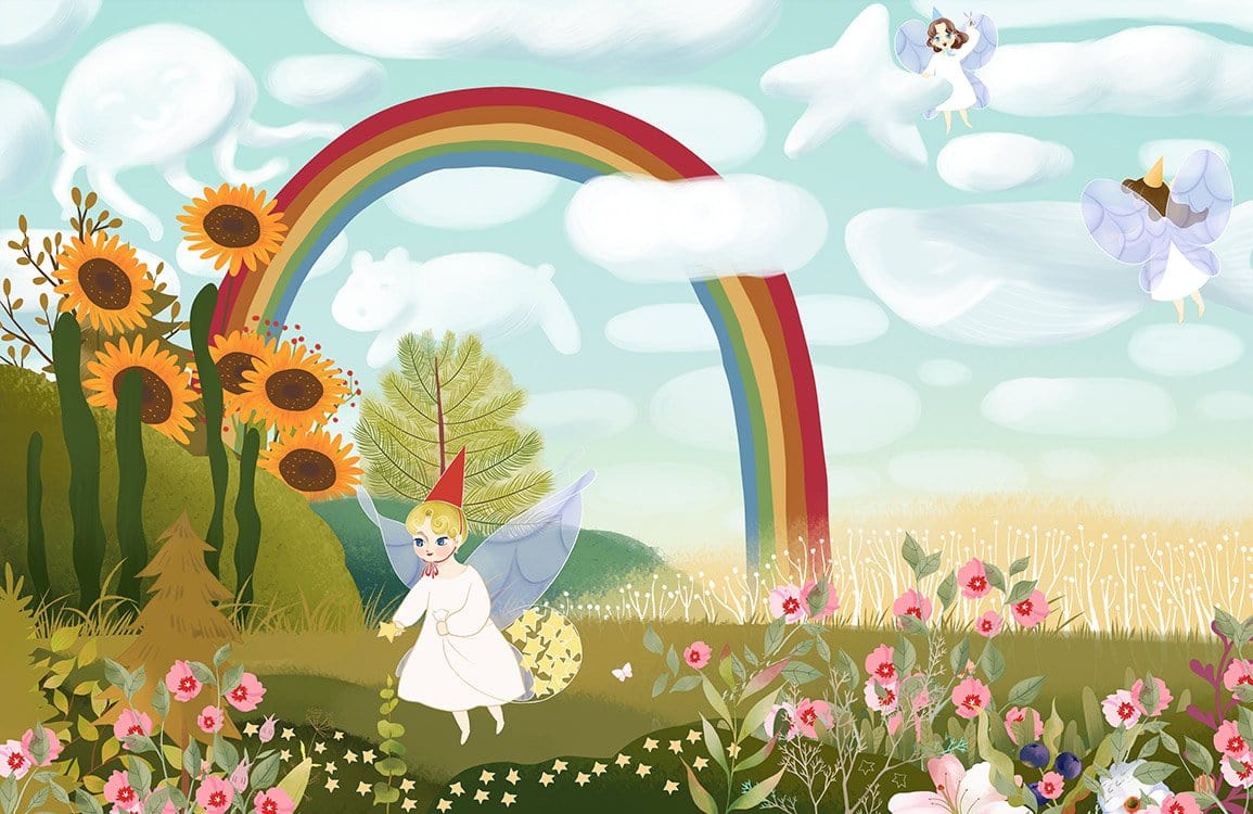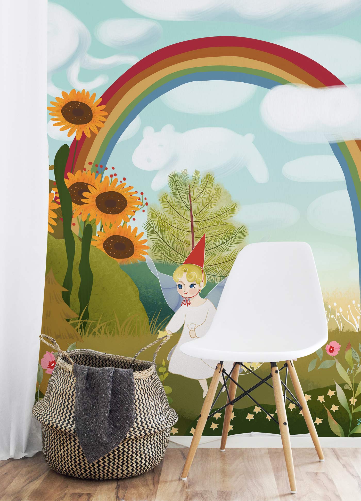 Send your kids to a wonderland with this amazing wallpaper mural, featuring rainbow, flowerss, grassland and cute spirits. Make your little ones dream come true of living in a fairy tale! Ideal wallpaper mural for kid's bedroom, play room and nursery room to turn your home interior space into a dreamy fantasy!