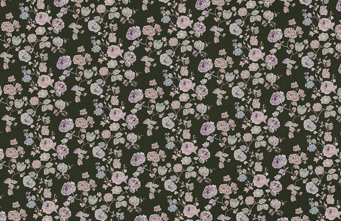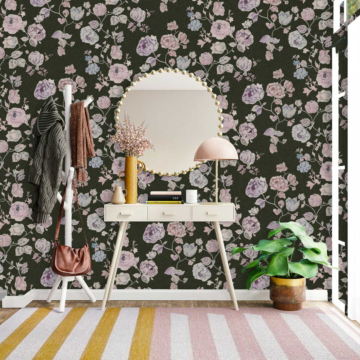 Beautify your home with this repeat flower pattern wallpaper mural. This design in dark black background with pink flowers crawling across your walls will instantly add more freshness to your rooms. Pair it with traditional furniture and home decors for a charming look to your Interiors.