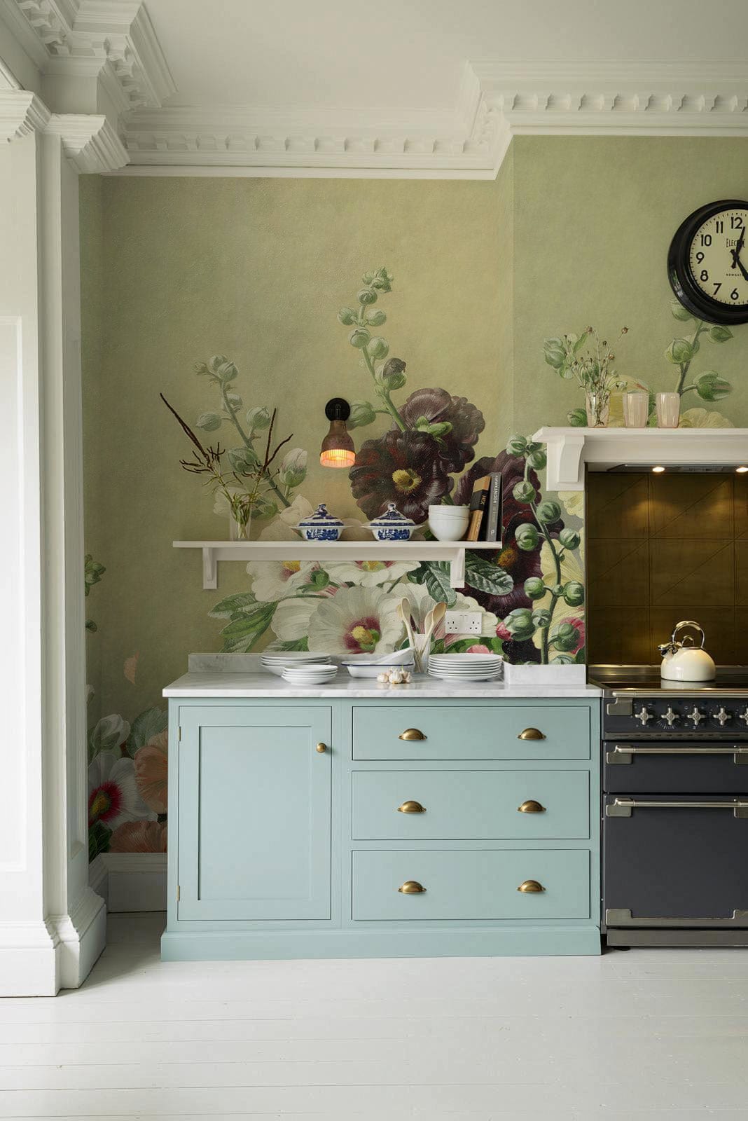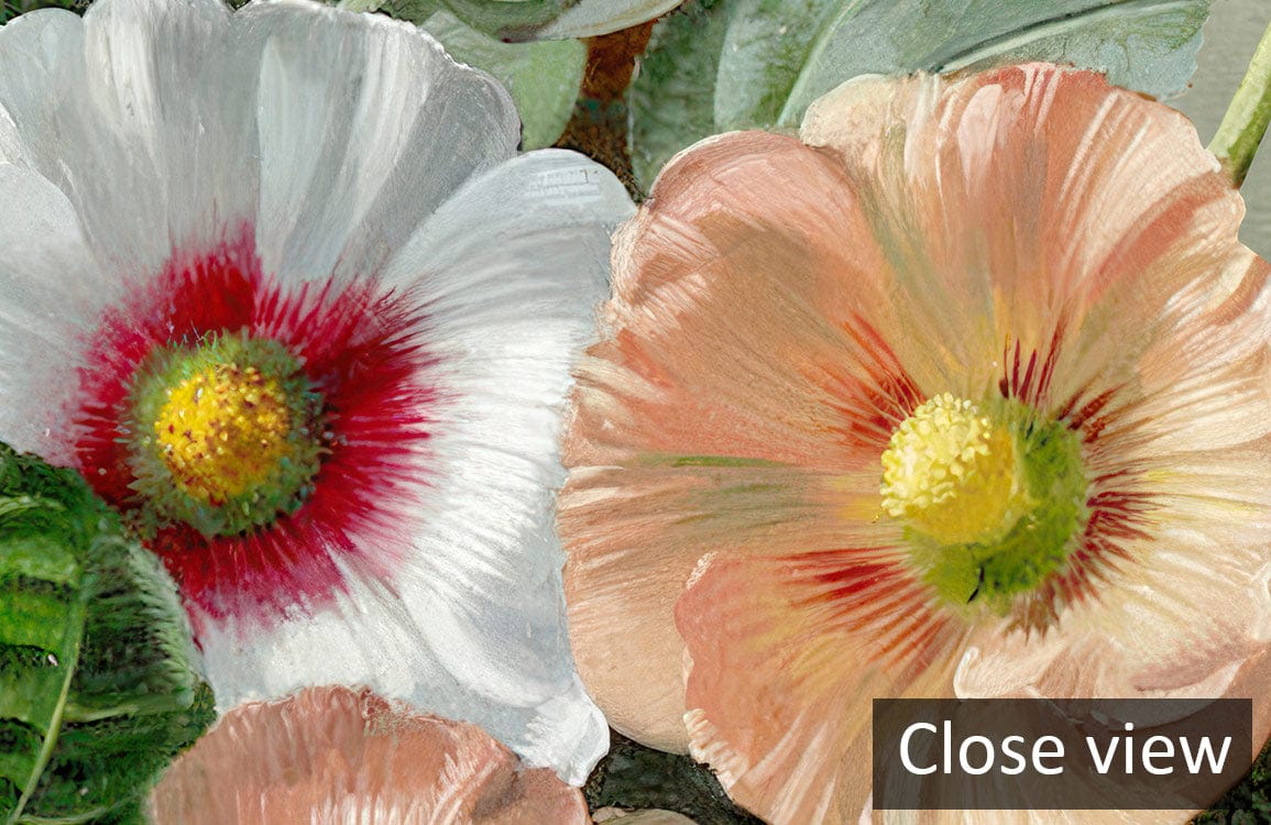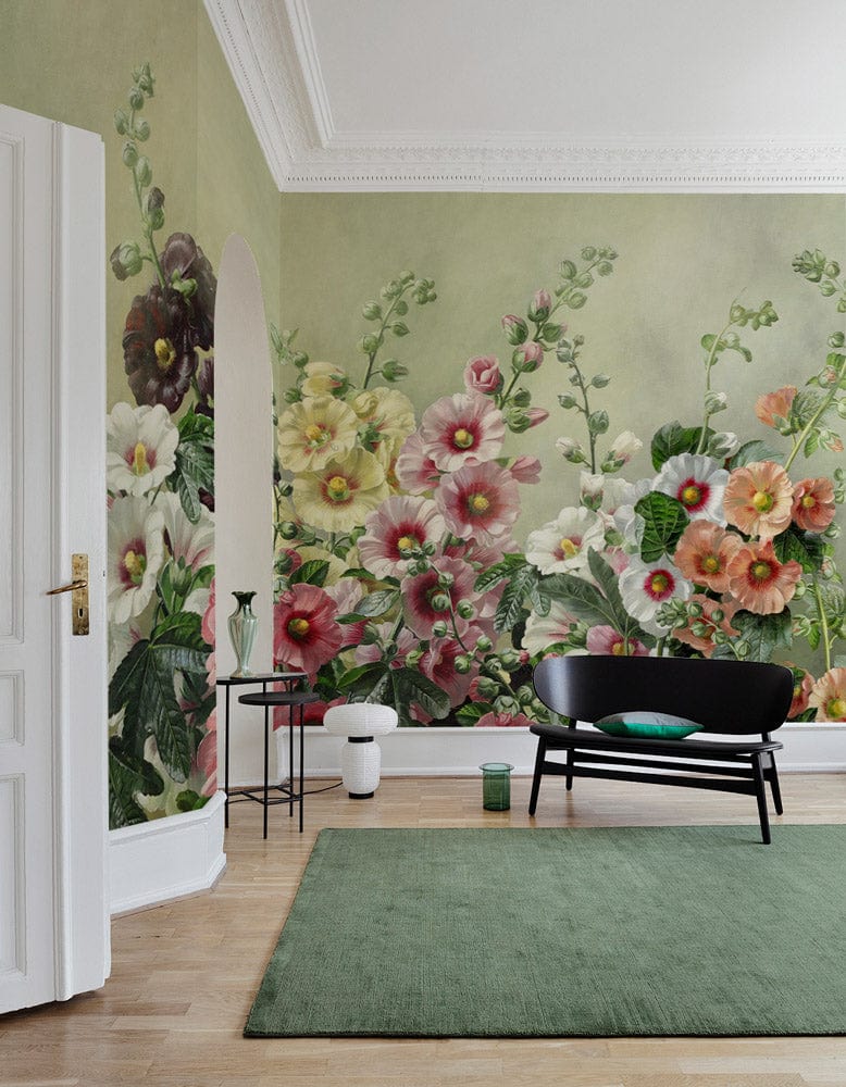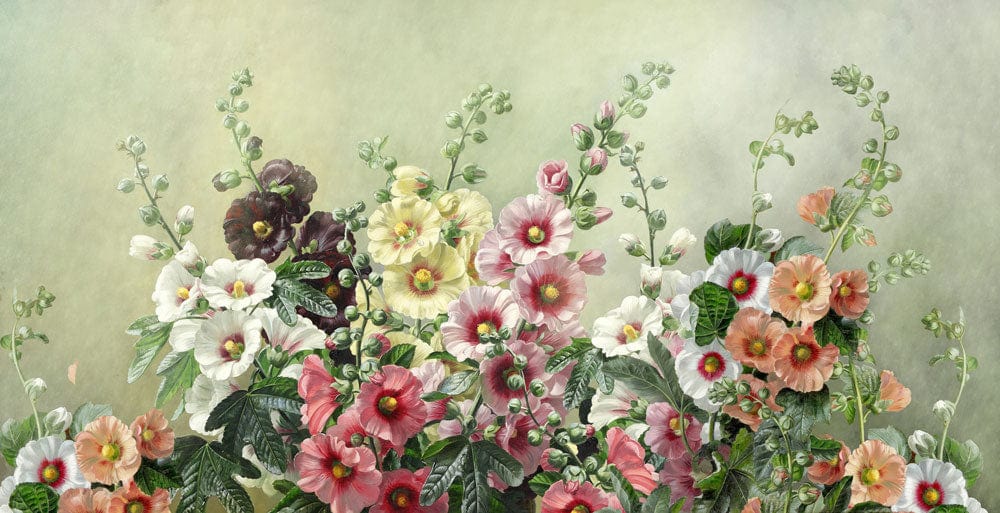 The Spring Blossom Garden Mural Wallpaper exudes a serene charm, capturing an exquisite array of flourishing hollyhocks against a muted backdrop. This mural's intricate detailing and vivid hues of pinks, greens, and soft whites create an atmosphere of blossoming elegance. Its artful representation of a garden in full bloom evokes a sense of timeless beauty, suitable for both contemporary and classic interiors.