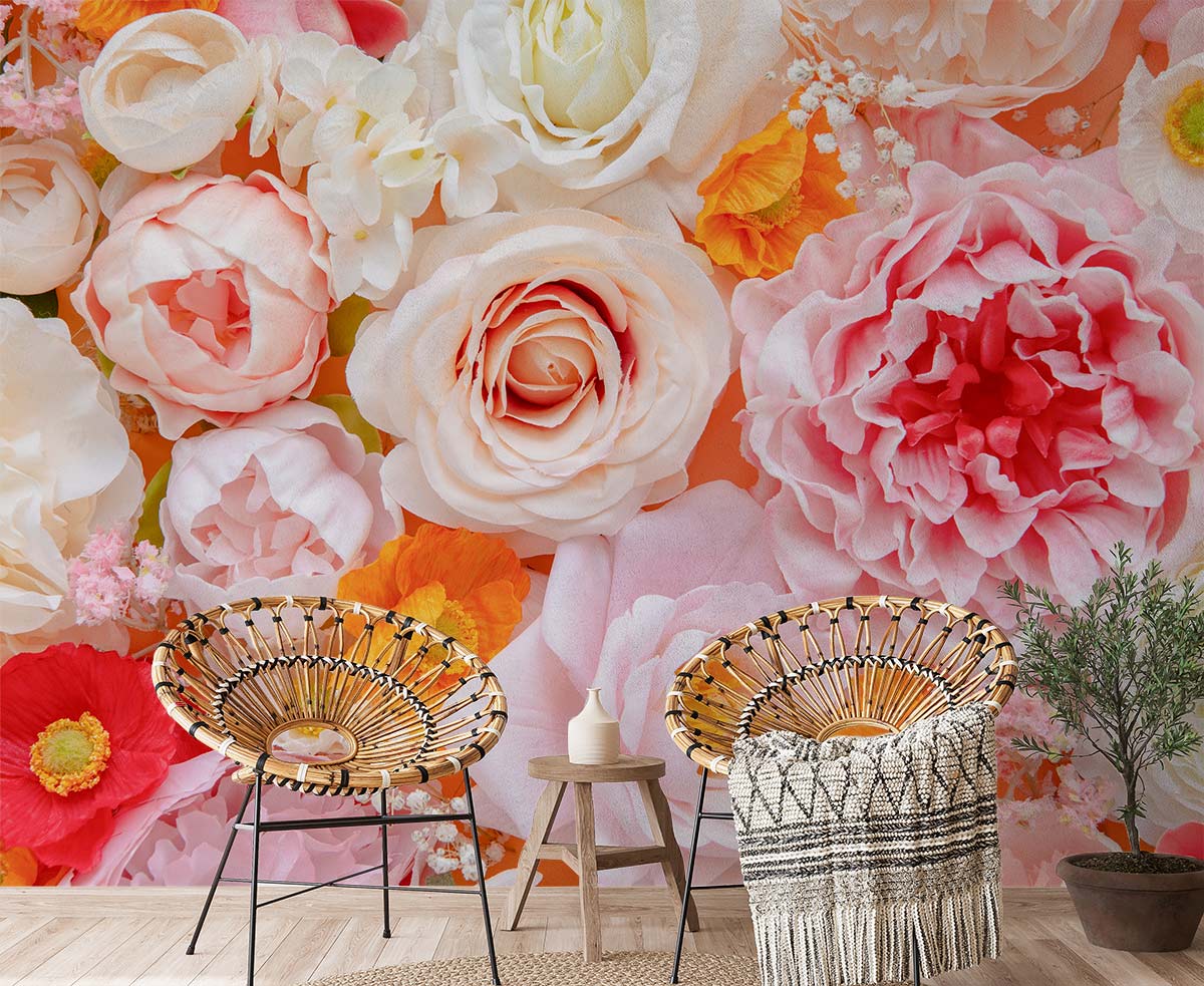 Embrace the exquisite beauty of nature with this Spring Flowers Wallpaper Mural, featuring a stunning array of blossoming peonies, roses, and daisies. The harmonious blend of soft pastels and vibrant hues creates an atmosphere of serenity and sophistication, making it a captivating focal point. Its delicate textures and intricate floral details lend a timeless elegance that complements both contemporary and classic interiors.