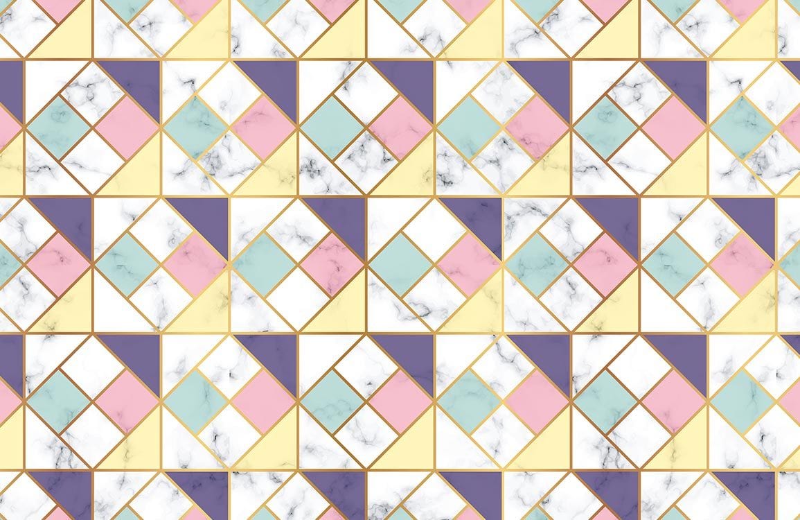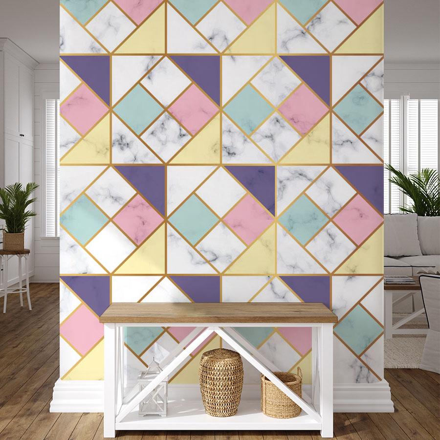 Welcome a sleek finish to your interior with this Marble Tile Effect Geometric Wallpaper Mural, a fresh wall effect design that will impress. Featuring a five colour backdrop with stylish white marble tiles scaled up from the bottom, this unique design will be sure to add an eye-catching element to your theme. The fresh white, yellow, pink, green and purple tones offer a contemporary style that隆炉s perfect for modern kitchens, bathrooms and more.