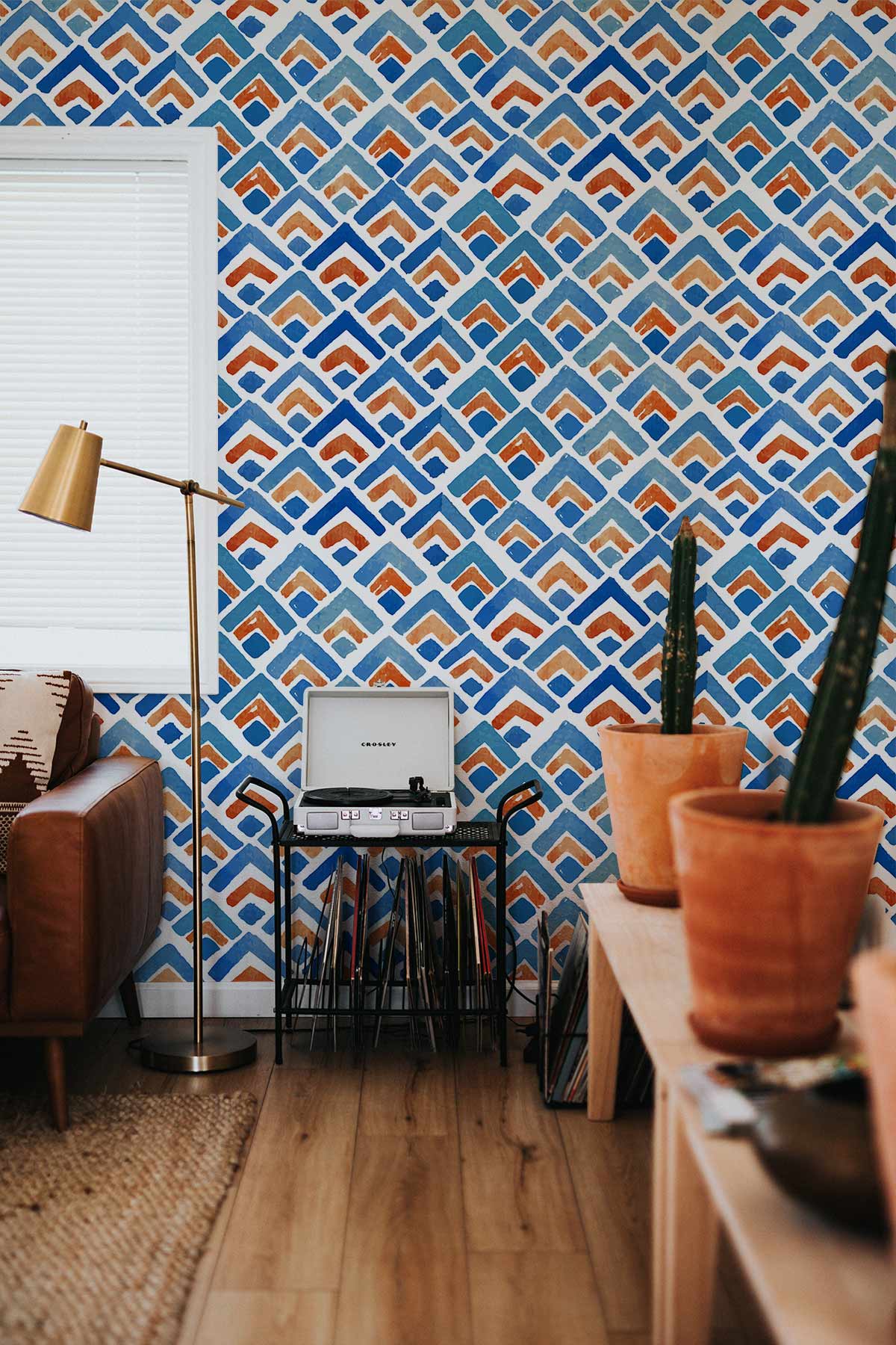 Infuse your interiors with a touch of geometric elegance through the Square Vector Wallpaper Mural. Its intricate design features a harmonious interplay of blues and oranges, creating a sense of depth and movement. Ideal for modern or contemporary spaces, this mural's rhythmic pattern offers a sophisticated backdrop that complements a range of decor styles, evoking both energy and balance.