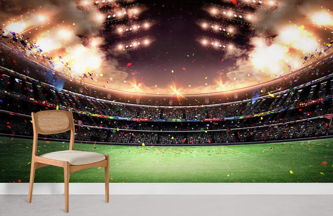 If you're dreaming of football, this Stadium at Night Wallpaper Mural will take you there. The lively wallpaper mural featuring stadium lighting and banners will surely make a statement in your home, no matter where you decide to put it. This soccer-themed mural creates a bold piece of wall art perfect for any sports lover in your life. Not only a great addition to your space, but this wallpaper is also easy to hang! Just paste it on the wall, and you're done!