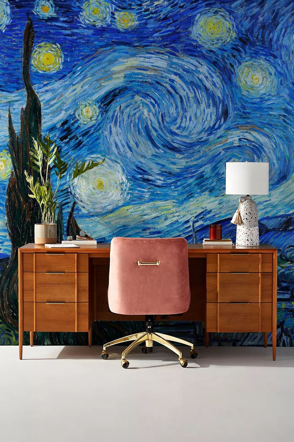 Spice up your space with the most treasured artwork of all times with this oil painting wallpaper mural. Bring home Van Gogh隆炉s most famous masterpiece 'Starry Night' in 1889. Splash some colours? to your interiors and transfrom your plain walls into fine art. Perfect wallpaper for modern simple style furniture and home decors.