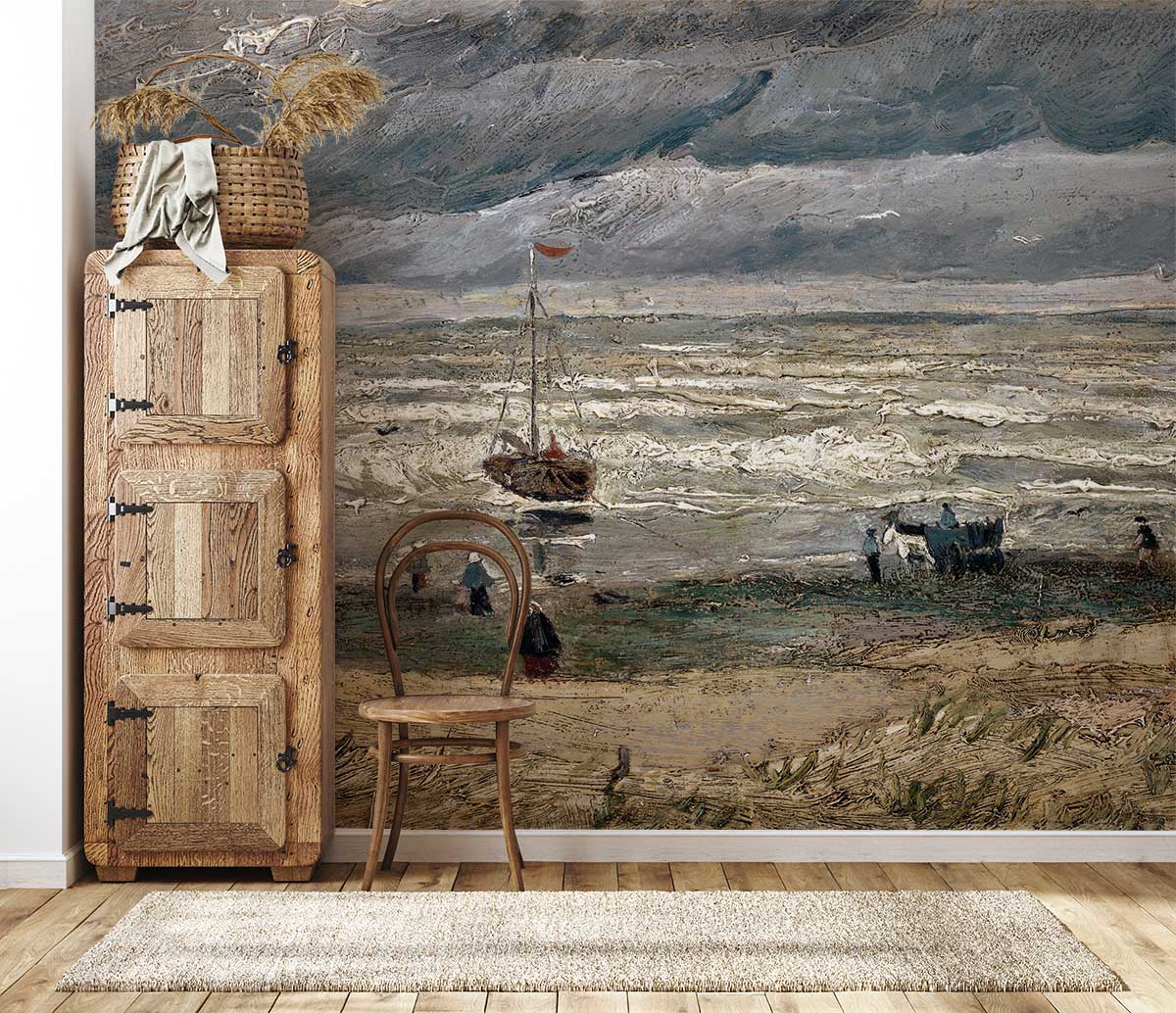 Immerse your space in the evocative tones of the Stormy Beach Wallpaper Mural, where the dynamic sea meets an intense sky, capturing the raw beauty of nature. The detailed textures and intricate brushwork evoke a serene and reflective atmosphere, seamlessly fitting into both contemporary and classic interiors.