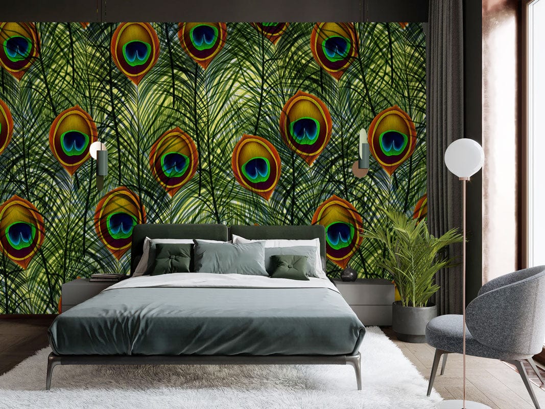 Drawing inspiration from the regal beauty of peacock plumage, this wallpaper mural introduces an elegant complexity to your space. The meticulous detailing of each feather, featuring delicate curves and vibrant eyespots, is captured in rich, lustrous colours. Ideal for creating a sophisticated backdrop, the mural seamlessly fits into a myriad of settings, offering an aesthetically pleasing visual experience with a timeless charm.