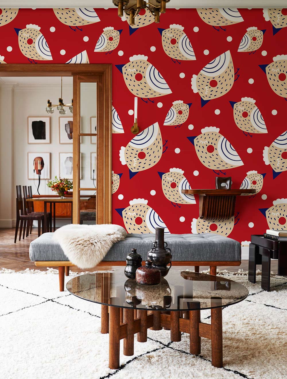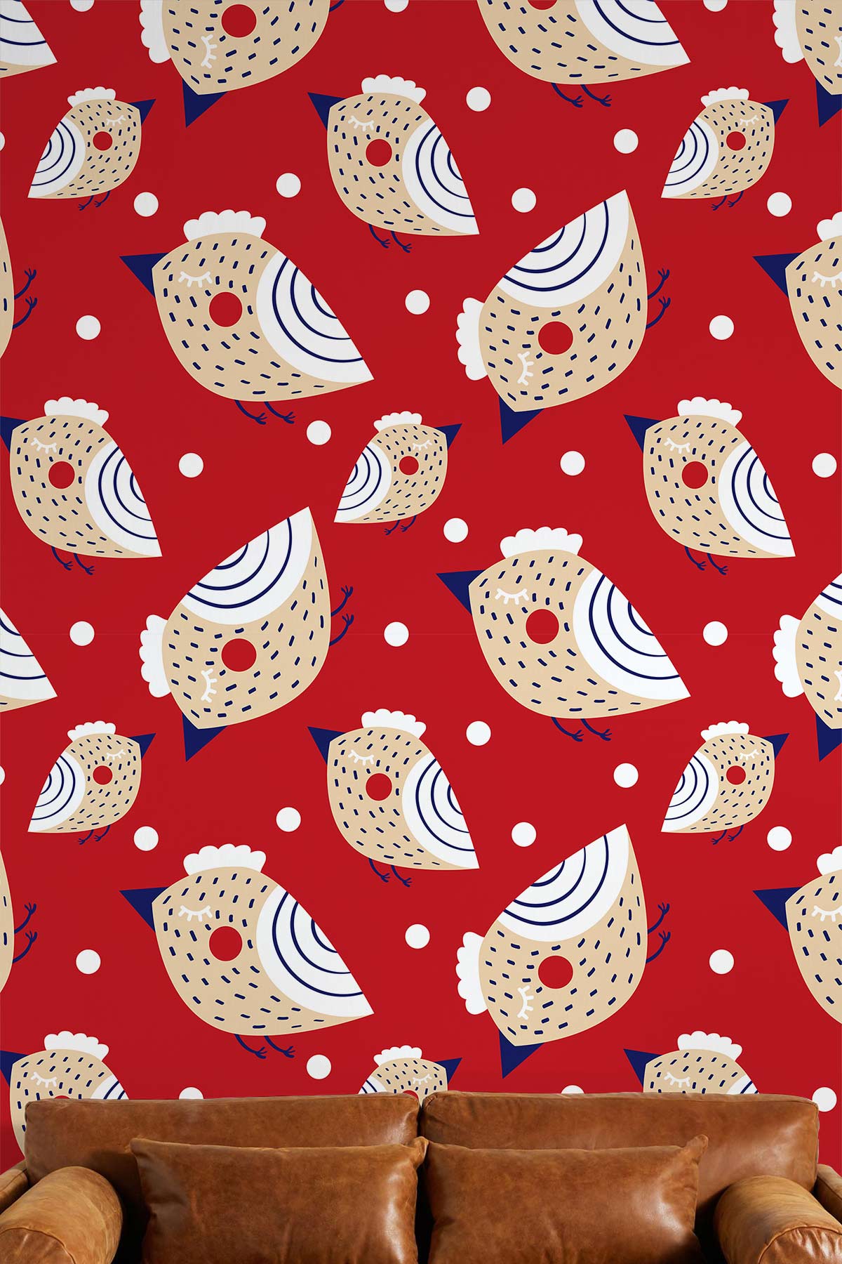 Invite a lively elegance into your space with the Strawberry Birds Wallpaper Mural. Featuring a vibrant ensemble of whimsical birds against a striking red backdrop, each element is intricately detailed with fine lines and graceful curves. Ideal for infusing character and charm, this mural effortlessly complements both classic and contemporary interiors, adding a touch of playful sophistication.