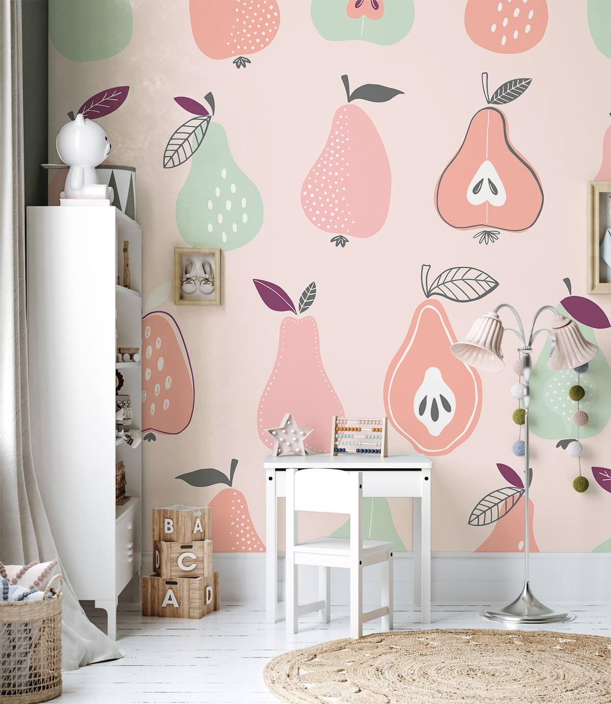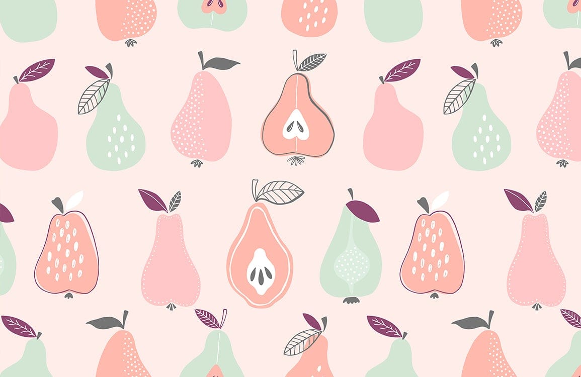 Infuse your space with the charming allure of the Summer Fruit Wallpaper Mural, featuring whimsical illustrations of pears and more in a striking palette. The soft pastel hues blend harmoniously, creating a playful yet sophisticated backdrop suitable for diverse interiors. Its artistic design introduces a touch of retro elegance, adding character and depth to any room.