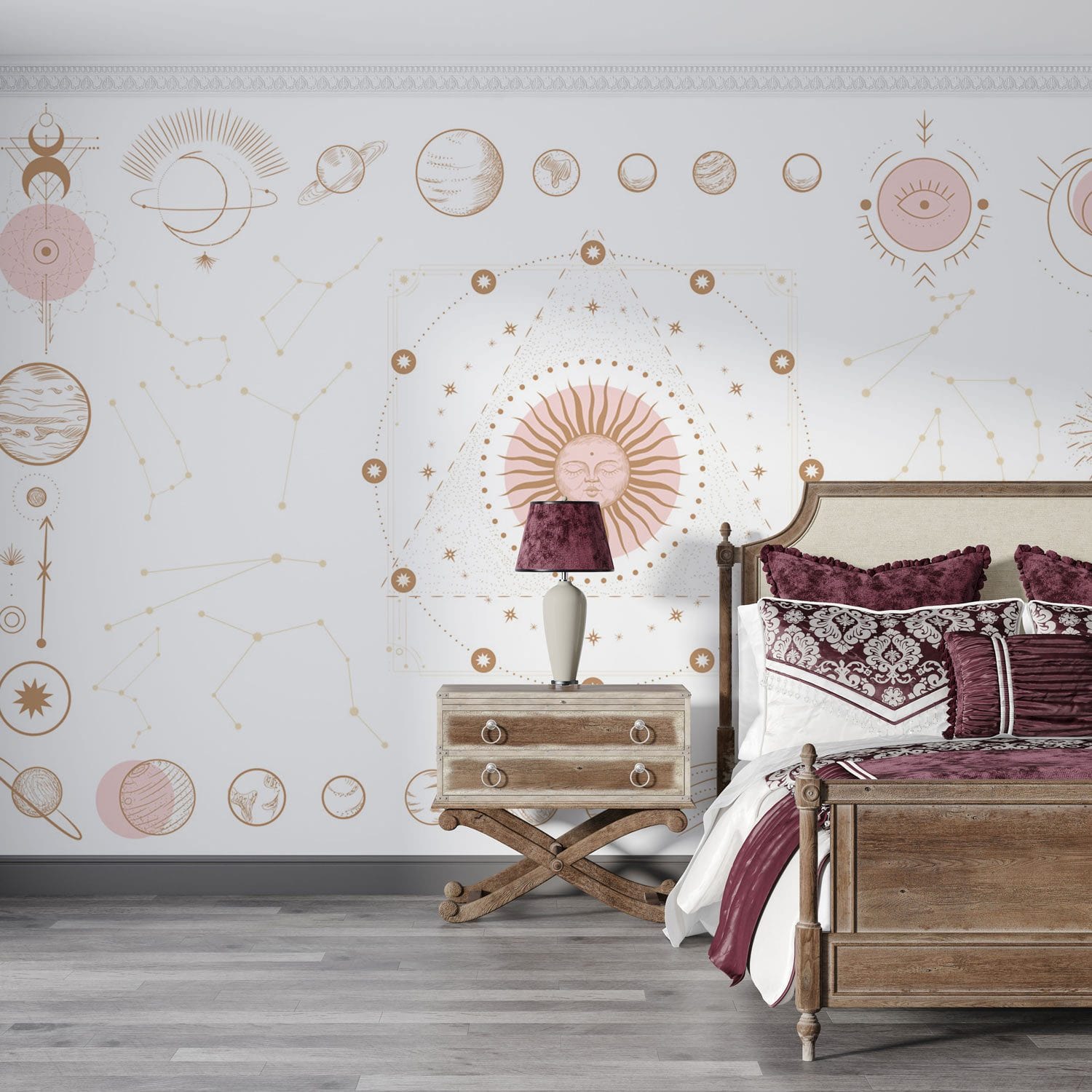 Embrace a celestial touch with the Planet Art Wallpaper Mural, where intricate solar motifs and planetary designs dance across your walls. The delicate fusion of astral symbols with geometric patterns achieves a sublime balance, captivating the eye and spirit. This mural imbues spaces with a serene yet sophisticated atmosphere, making it a worthy addition to homes seeking an aura of cosmic elegance.
