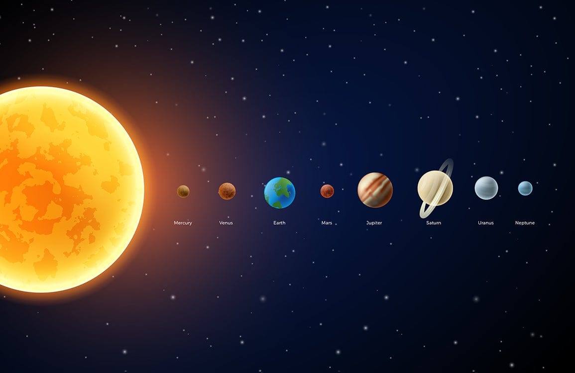 Immerse your space in celestial elegance with the Sun & Planets Wallpaper Mural. Featuring a vivid depiction of our solar system set against a deep, star-studded backdrop, this mural offers a captivating focal point for any room. The meticulous detailing and harmonious blend of vibrant hues convey a sense of wonder and curiosity, elevating the ambience to an artistic reverie. Perfect for integrating a timeless astronomical allure into an office, a living room, or a child's bedroom.