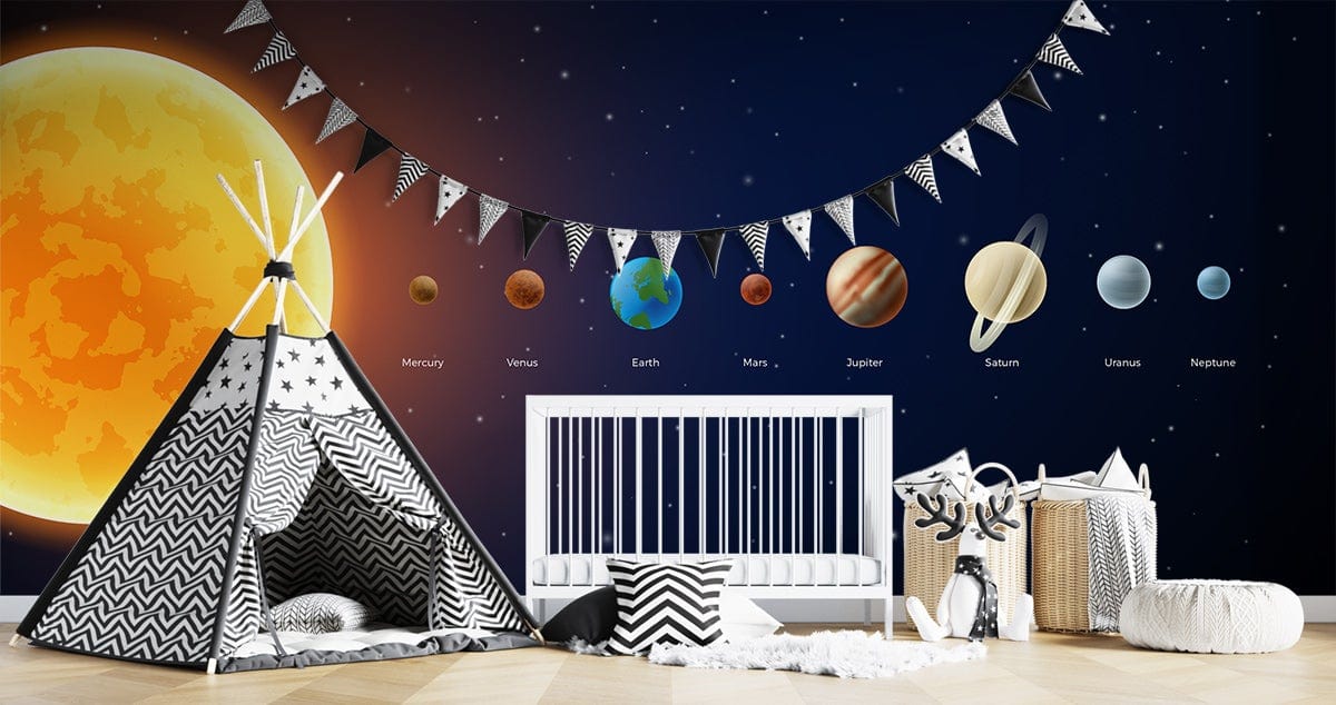 Give your children a new fun way to know more about the space and our solar system throughout our illustrative collection for kids and teenagers. This design is so simple yet so elegant to decorate your kids鈥?room. The design is showing the sun and the eight planets that move in orbits around the sun. this is a nice mural wallpaper that will give the chance for your students at the school to get to know more about their universe and what surround it with simple easy methods of learning. This was of teaching will let them memorize always the names of the planets because it will be in front of their eyes daily so they will have also the chance to ask more about each planet and build their own knowledge.