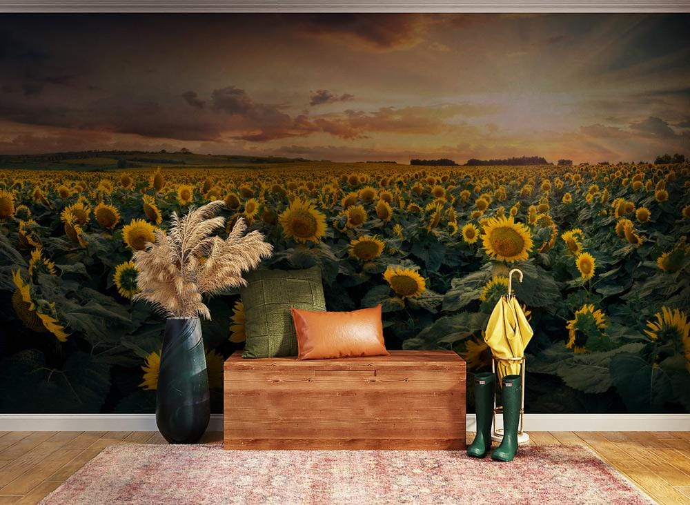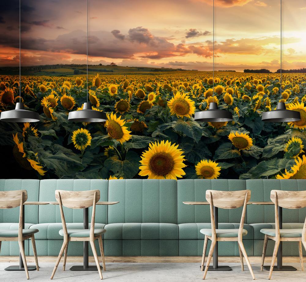 Splash some colours and revamp your walls with this beautiful sunflower field wallpaper mural. This photorealistic style sunflower land under orange sunset will look great in your living room, bedroom and hallway. Enjoy the made-to-measure wall mural and brings natural close to you in your interiors.