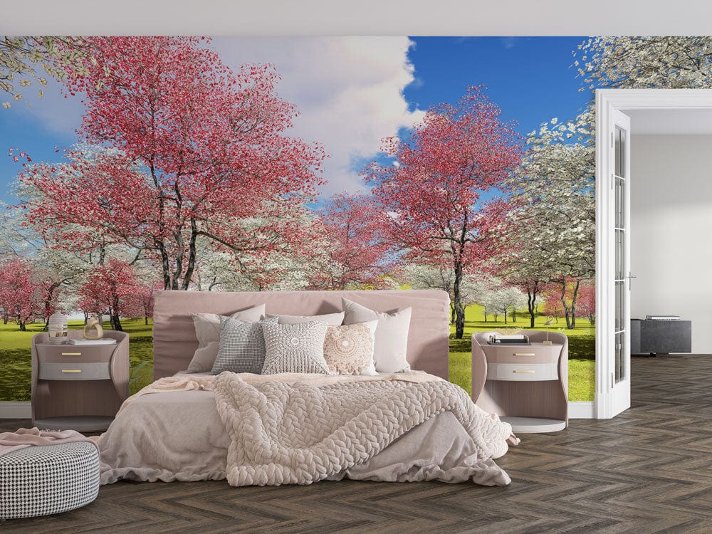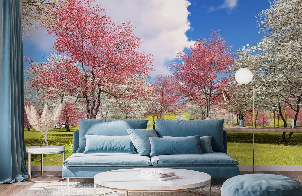 Step into a serene landscape with the Sunny Garden Wallpaper Mural, where delicate cherry blossoms and vibrant foliage weave a tapestry of blossom-strewn elegance against a clear azure sky. This mural fills any interior space with a timeless tranquillity, making it an exquisite backdrop in both classic and contemporary settings.