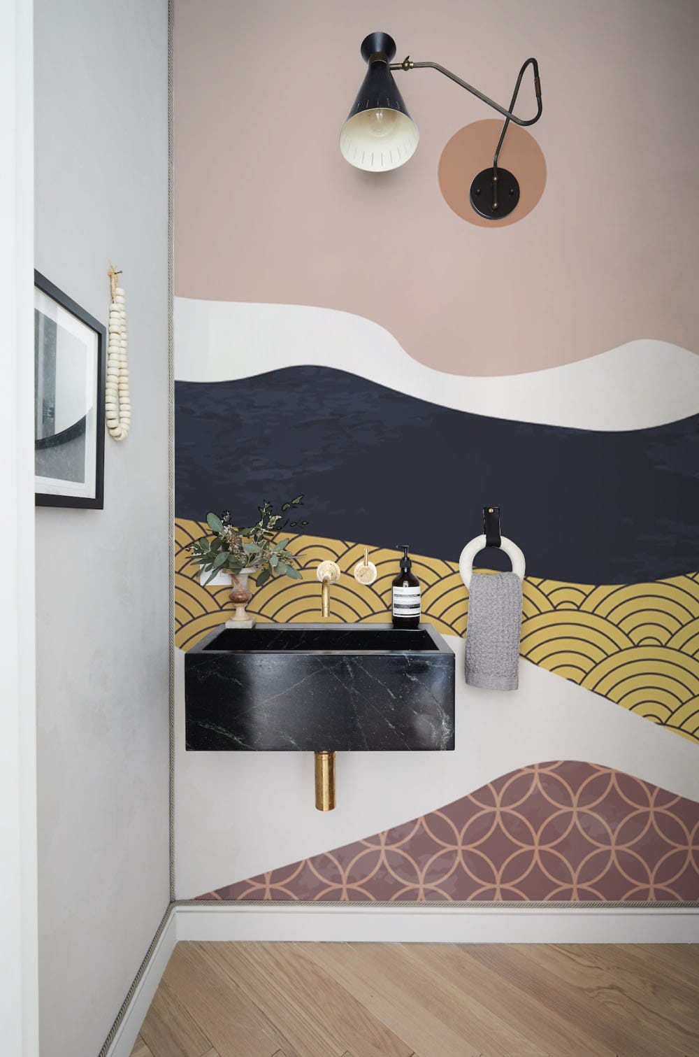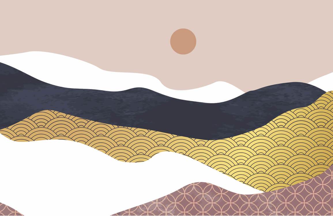 The Sunrise Wallpaper Mural presents a harmonious blend of abstract waves and delicate patterns, capturing the tranquil beauty of dawn. Its soft beige sky, contrasted with opulent gold and deep blues, evokes serenity and sophistication. Suitable for various settings, this mural offers an artistic backdrop that complements both contemporary and classic interiors.