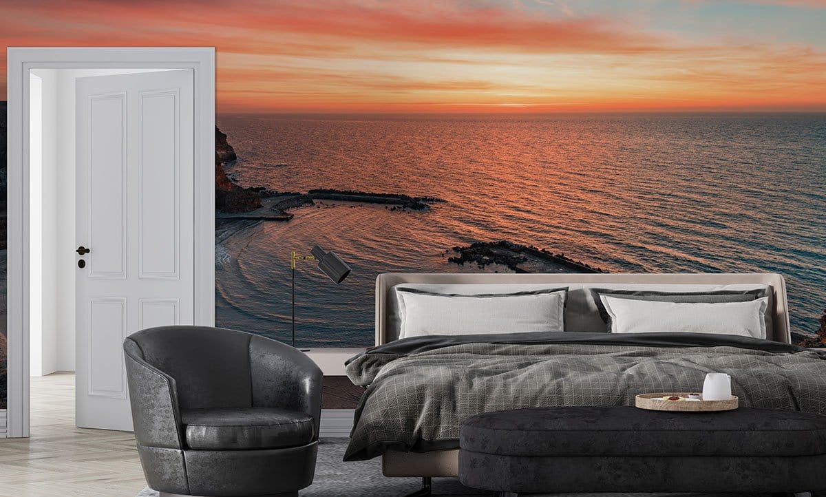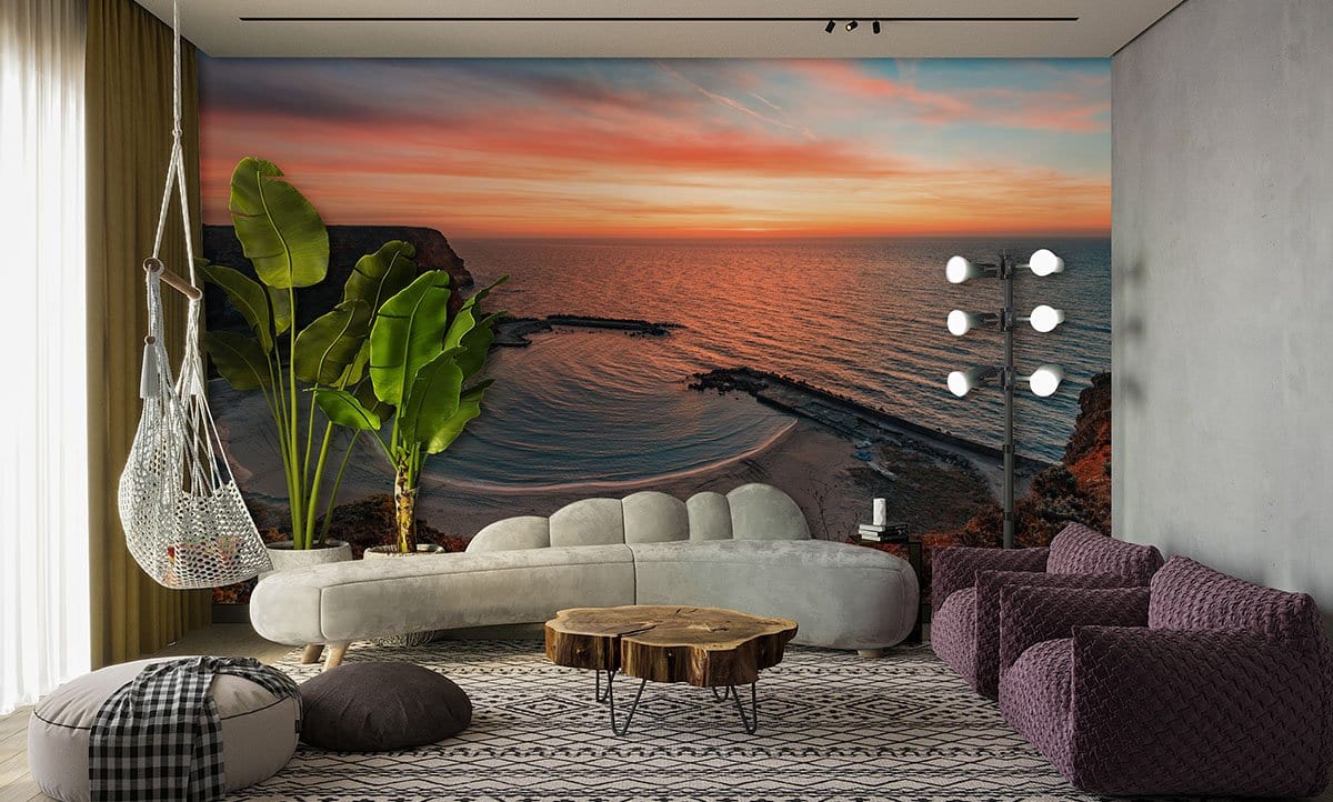 Immerse your space in the captivating allure of the Sunset Glow Wallpaper Mural. This exquisite design captures the serene beauty of a sunset over a tranquil bay, with gentle waves lapping against the shore. The intricate details and soft, natural textures evoke a sense of calm and sophistication, making it a distinguished addition to any interior. Its timeless appeal ensures it elegantly graces living rooms, bedrooms, or offices with a tranquil ambience.