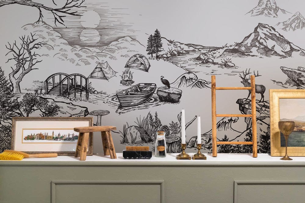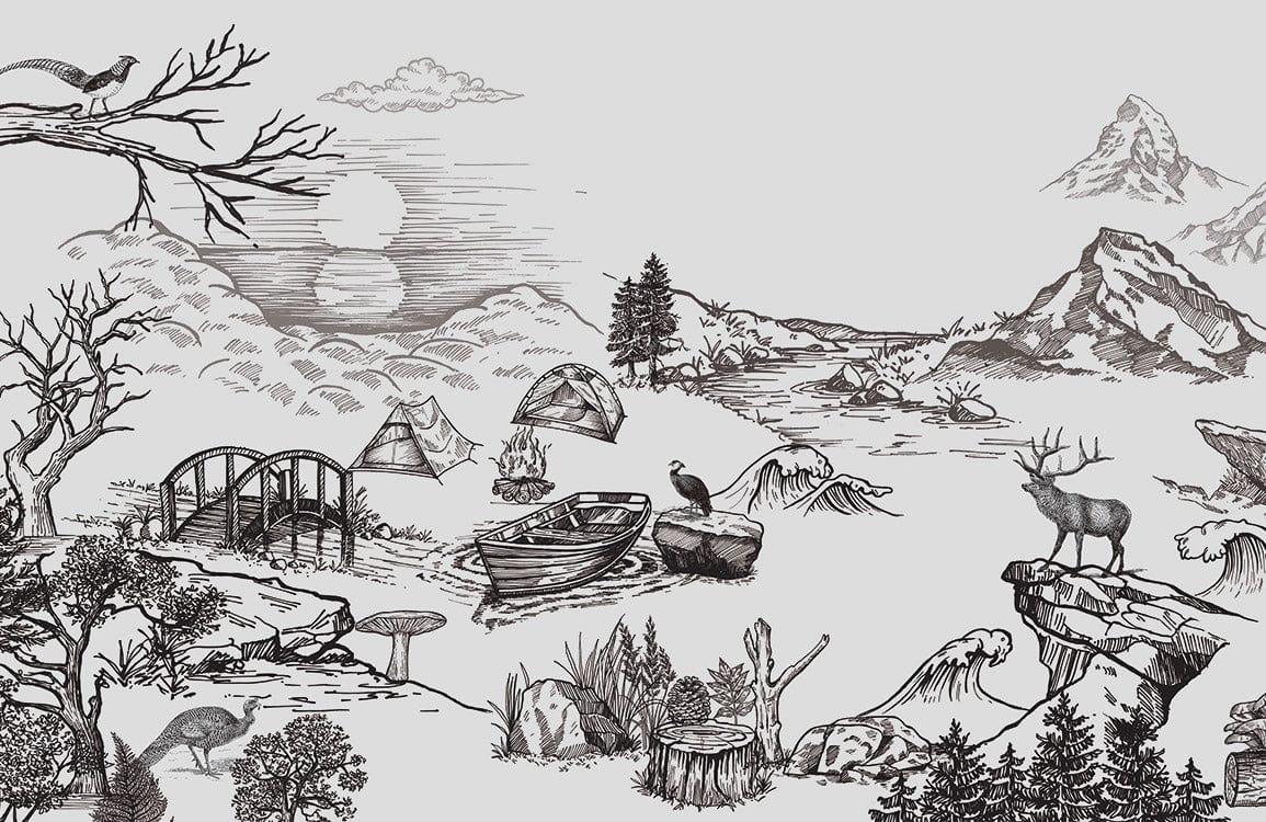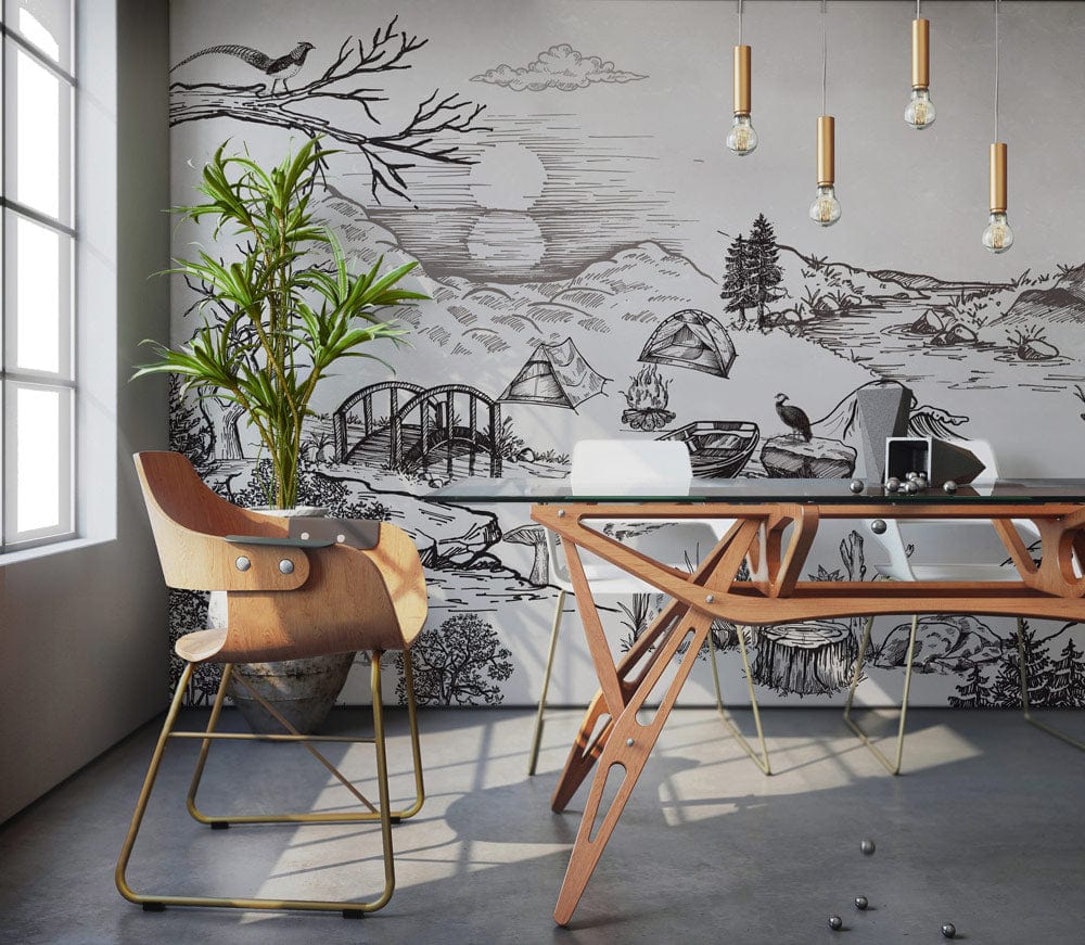 Exquisitely crafted, the Sunset Landscape Sketch Wallpaper Mural captures the serene beauty of nature with its intricate detailing of mountains, rivers, and rustic elements. The monochromatic palette adds a subtle elegance that suits a range of interiors, while the blend of vintage allure and contemporary minimalism creates a sophisticated atmosphere.