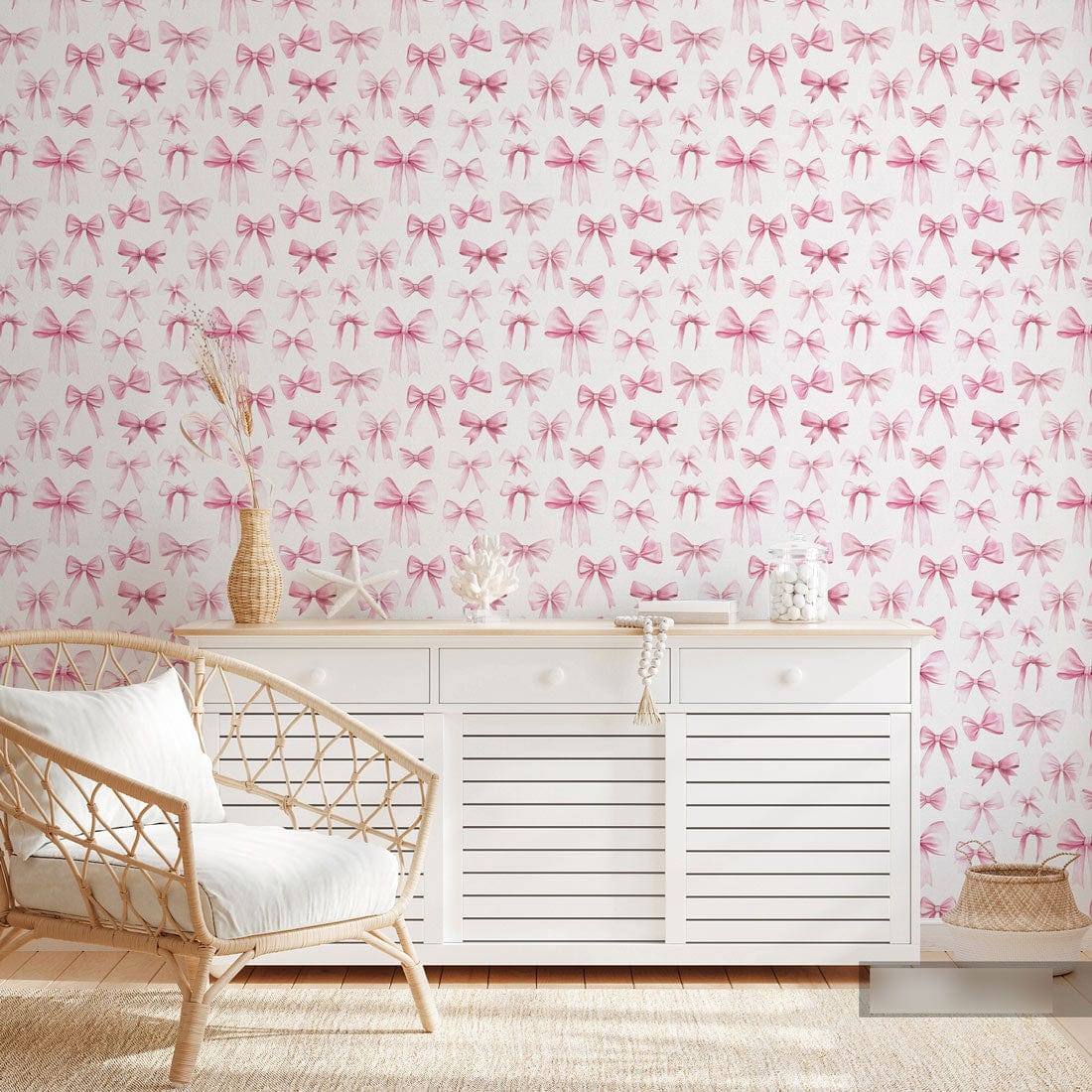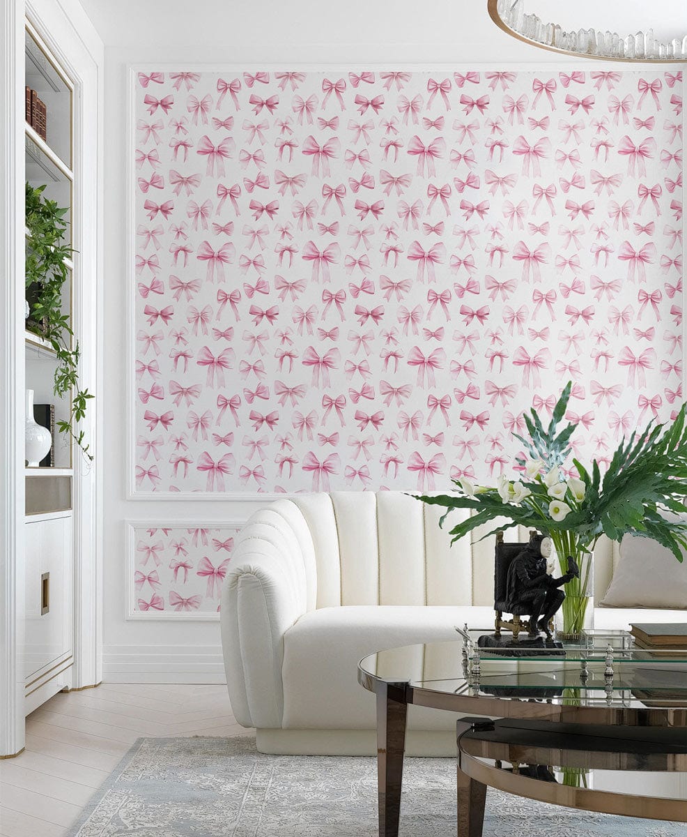 Sweet Pink Bows Mural Wallpaper exudes charm with its intricate pattern of delicate bows in varying shades of pink, set against a soft white backdrop. This design effortlessly captures an air of whimsy and elegance, making it an ideal choice for spaces seeking a touch of refined playfulness. Its detailed pattern invites timeless beauty into any room, creating a sophisticated yet playful atmosphere that complements diverse interior settings.
