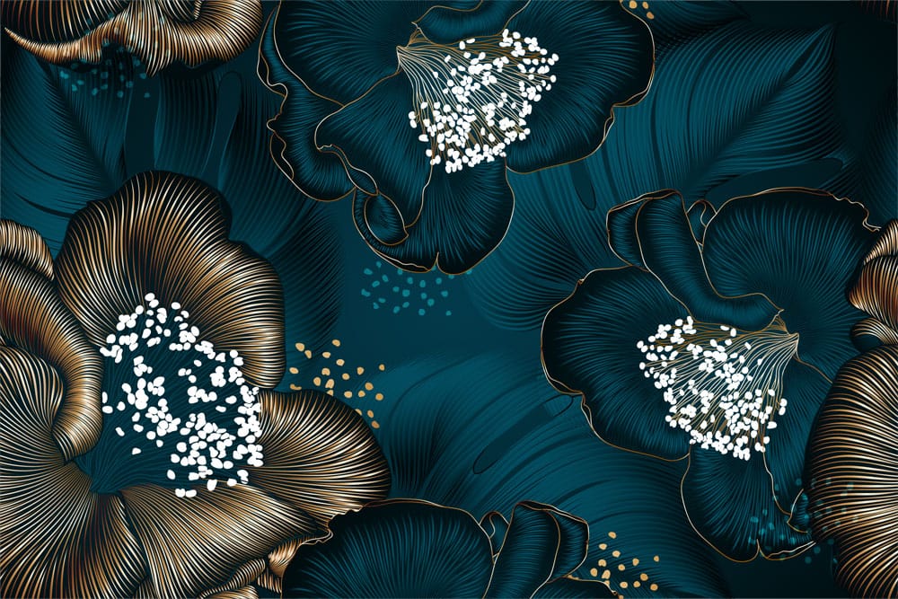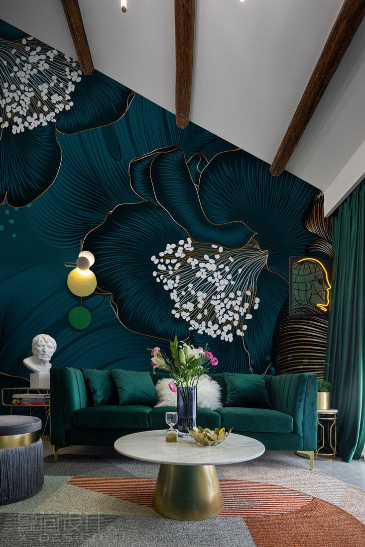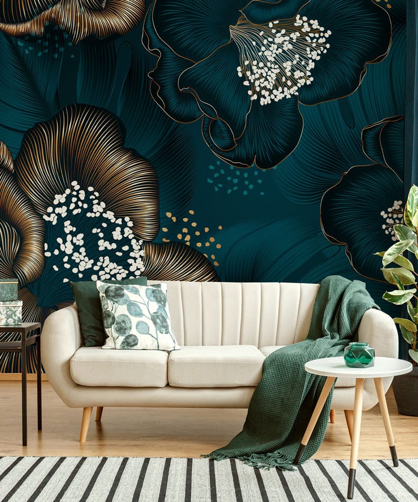 Immerse your space in opulence with the Teal Blossom Luxury Mural Wallpaper, featuring an exquisite floral design. Rich teal tones paired with metallic accents create a sense of depth and sophistication, while delicate, intricate blossoms bring a touch of nature into any room. This mural's commanding presence makes it an ideal centrepiece, adding artistic drama and timeless elegance to a myriad of interior settings.