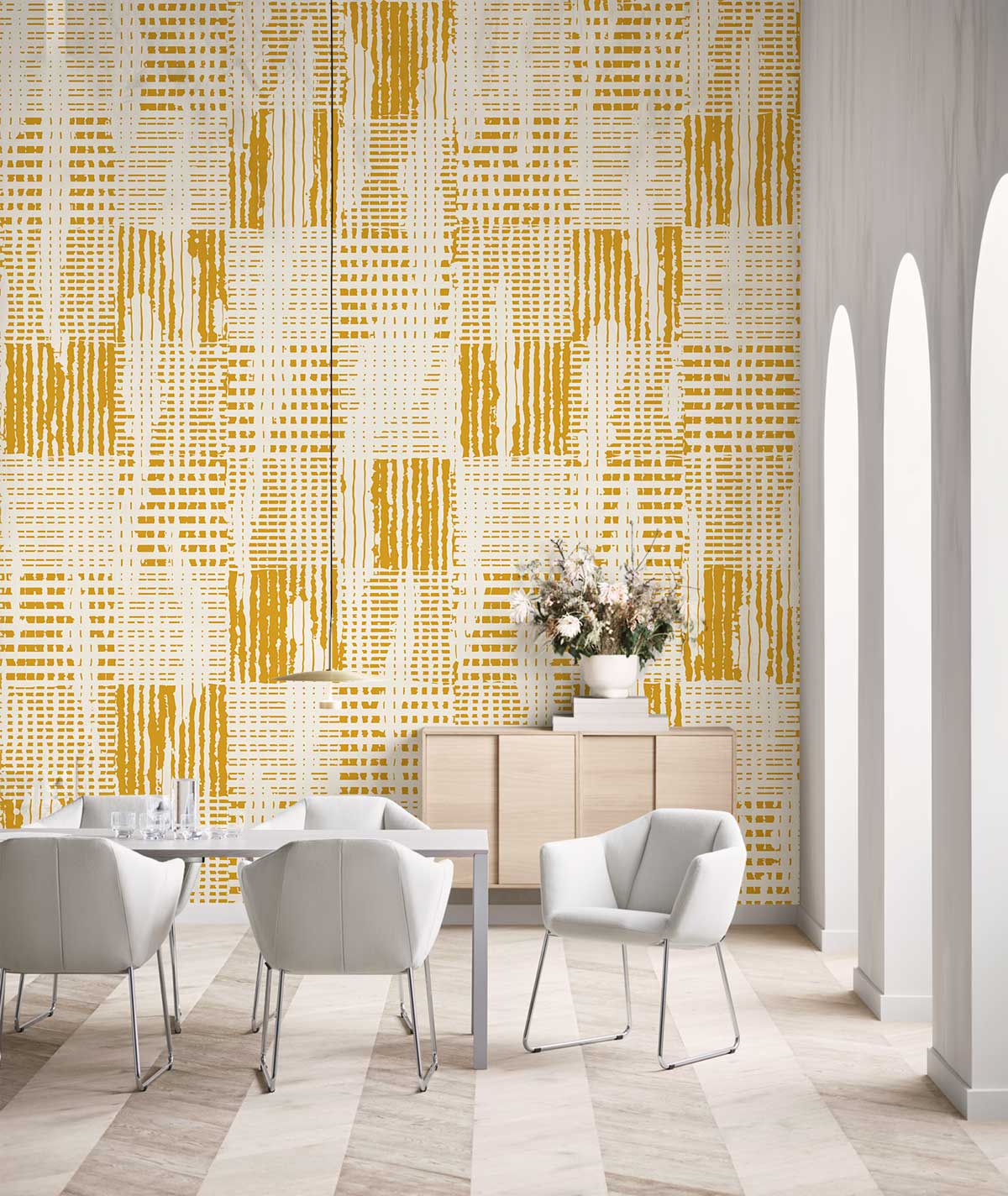 The Texture Maze Wallpaper Mural captivates with its intricate pattern of geometric shapes and fine linear textures, weaving a tapestry of ochre and cream tones. This mural evokes a sense of timeless elegance, seamlessly integrating into both modern and traditional interiors. Its subtle detail invites a play of light, creating dynamic visual interest in any space.