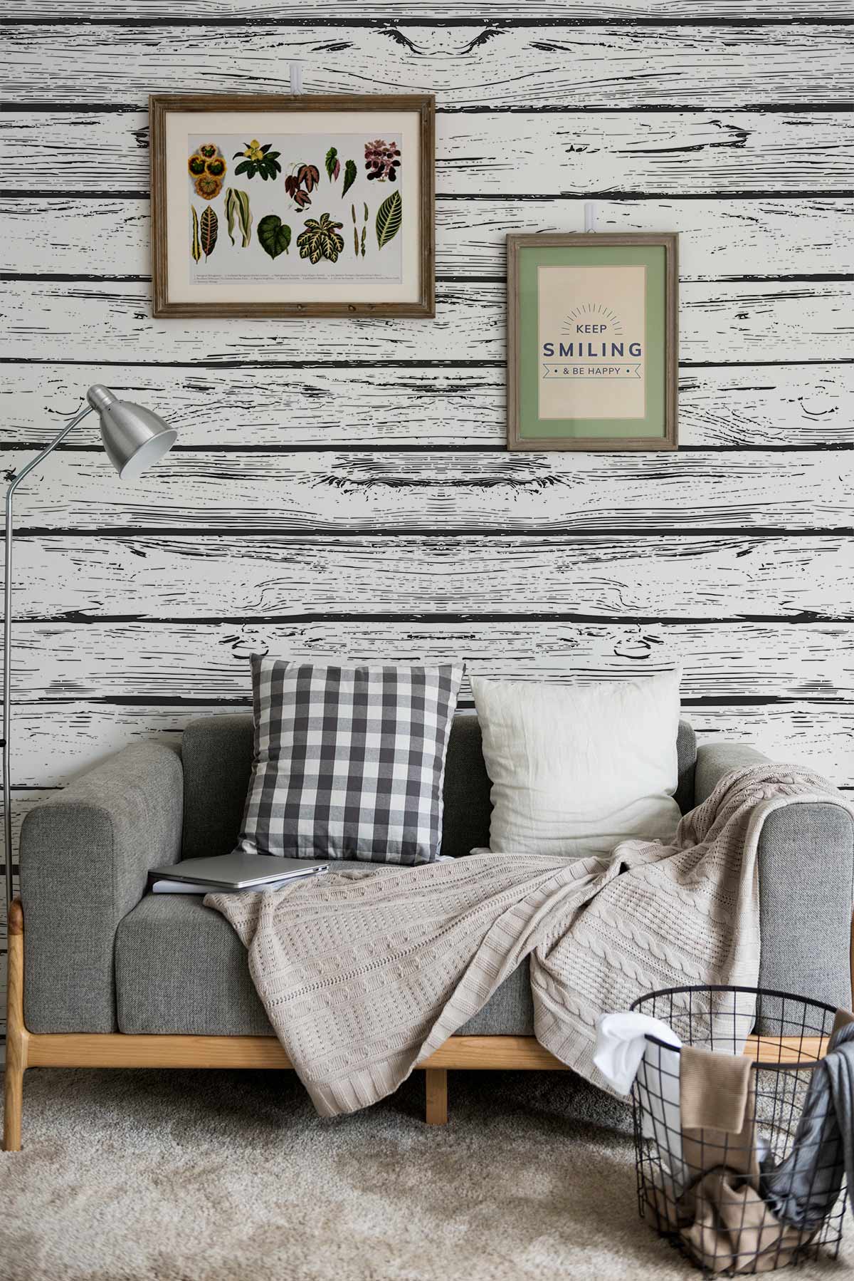 Contemplate the beauty of this simple mural wallpaper for texture wooden white slabs. As the wallpaper design is horizontal with black and white detailed texture it gives the impression that the place looks wider, and given the larger scale to the area. These white wooden slabs make the place look bright and more positive. This wooden texture mural will be perfect for a modern neutral living room. Add different colours in decoration for a booming and chic style at your place that attracts the eyes to your place and impress everyone.