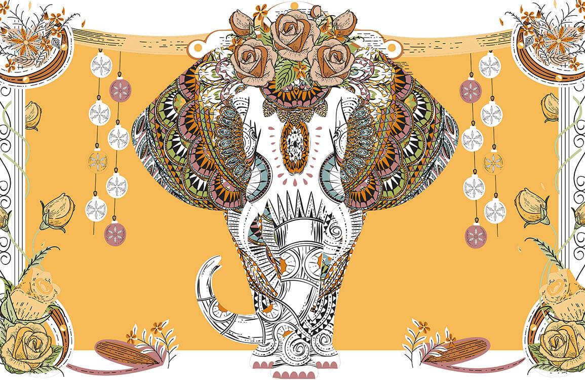 Adorn your walls with the Thai Elephant Wallpaper Mural, a stunning blend of intricate patterns and graceful details. This design showcases an elegant elephant motif adorned with roses and ornate feathers, set against a rich mustard background. Perfect for creating a sophisticated ambience, it seamlessly fuses cultural artistry with contemporary flair, making it an exquisite choice for various interiors.