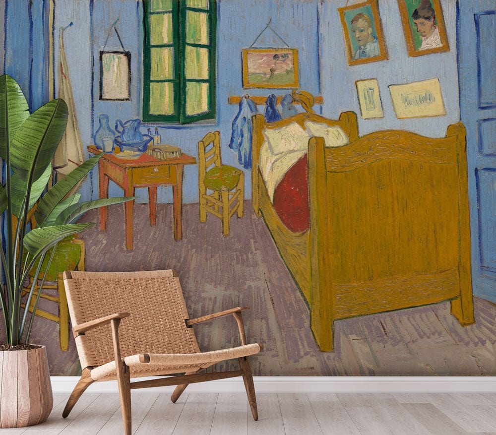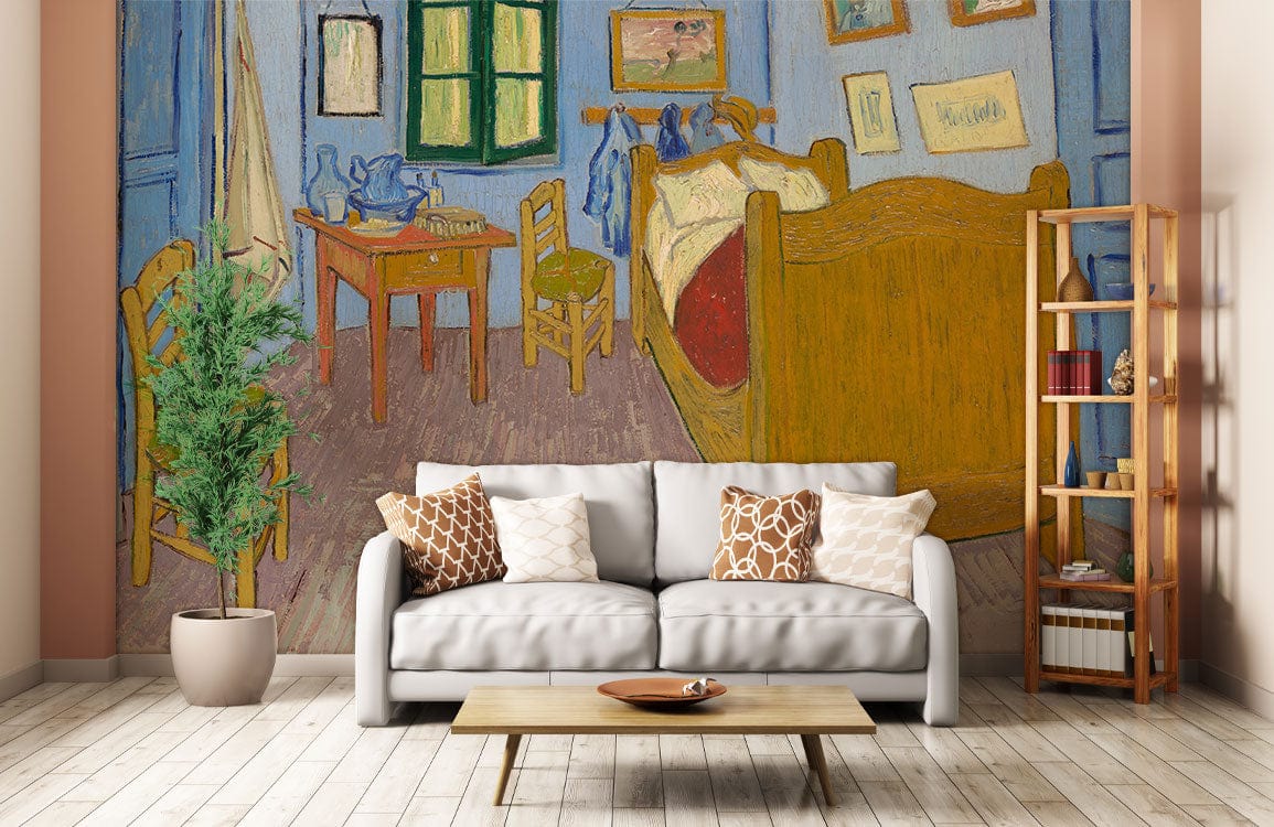 Immerse your space in artistry with The Bedroom Wallpaper Mural, capturing a serene bedroom scene intricately designed with vivid brushstrokes. The mural's harmonious blend of rich greens and muted yellows against a calming blue backdrop evokes a sense of tranquillity, offering a timeless aesthetic that effortlessly suits both classic and contemporary interiors. Its textured details and evocative composition create an inviting ambience, perfect for adding a touch of elegance and sophistication.