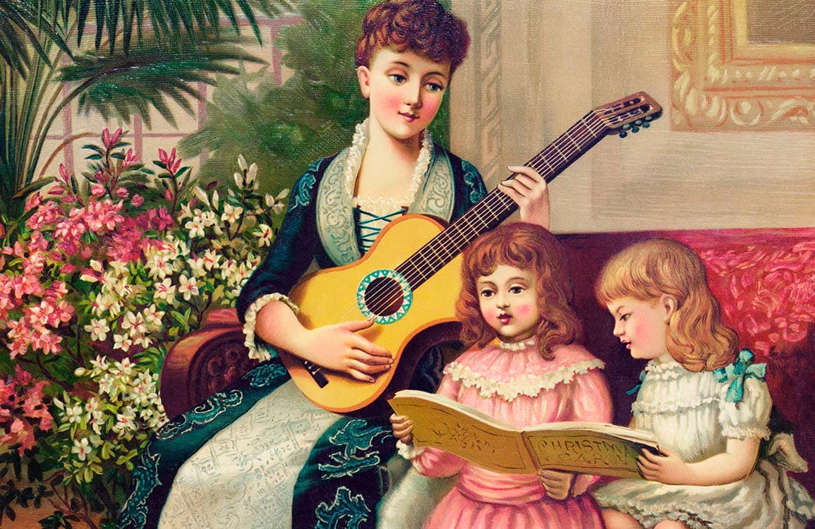Immerse in a charming scene of vintage elegance with The Christmas Carol Wallpaper Mural, where a family ensemble of musical moments unfolds. Delicate details captivate the eye, with finely painted florals framing the intimate vignette. Add a touch of nostalgia and grace to any space, evoking warmth and sophistication in your home's atmosphere.