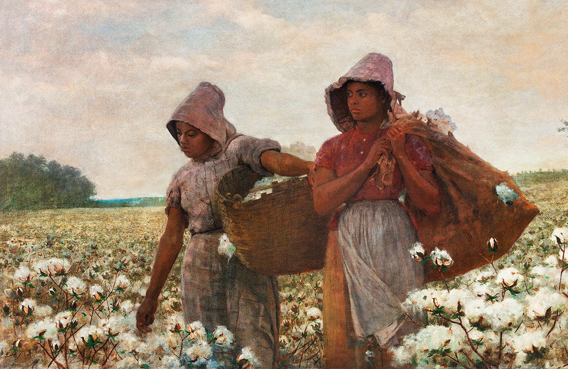 Immerse your space in the rustic charm and historical elegance of The Cotton Pickers Wallpaper Mural. This exquisite piece features intricate artistry capturing two figures amidst a sprawling cotton field. With delicate, yet striking strokes, the mural evokes a sense of timeless pastoral beauty, offering an artistic backdrop that complements a range of interior styles.