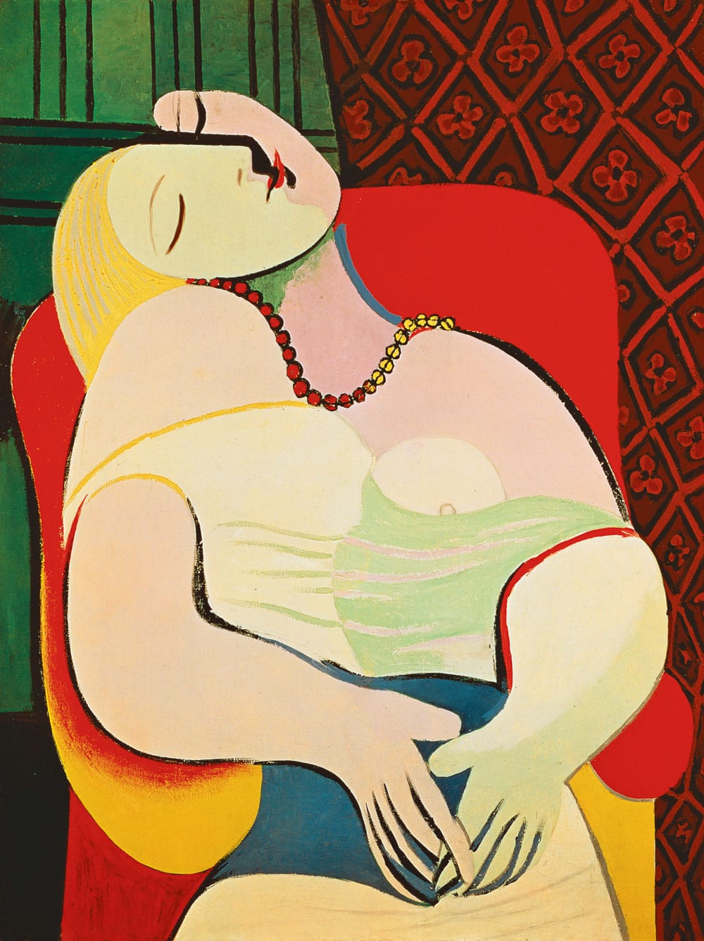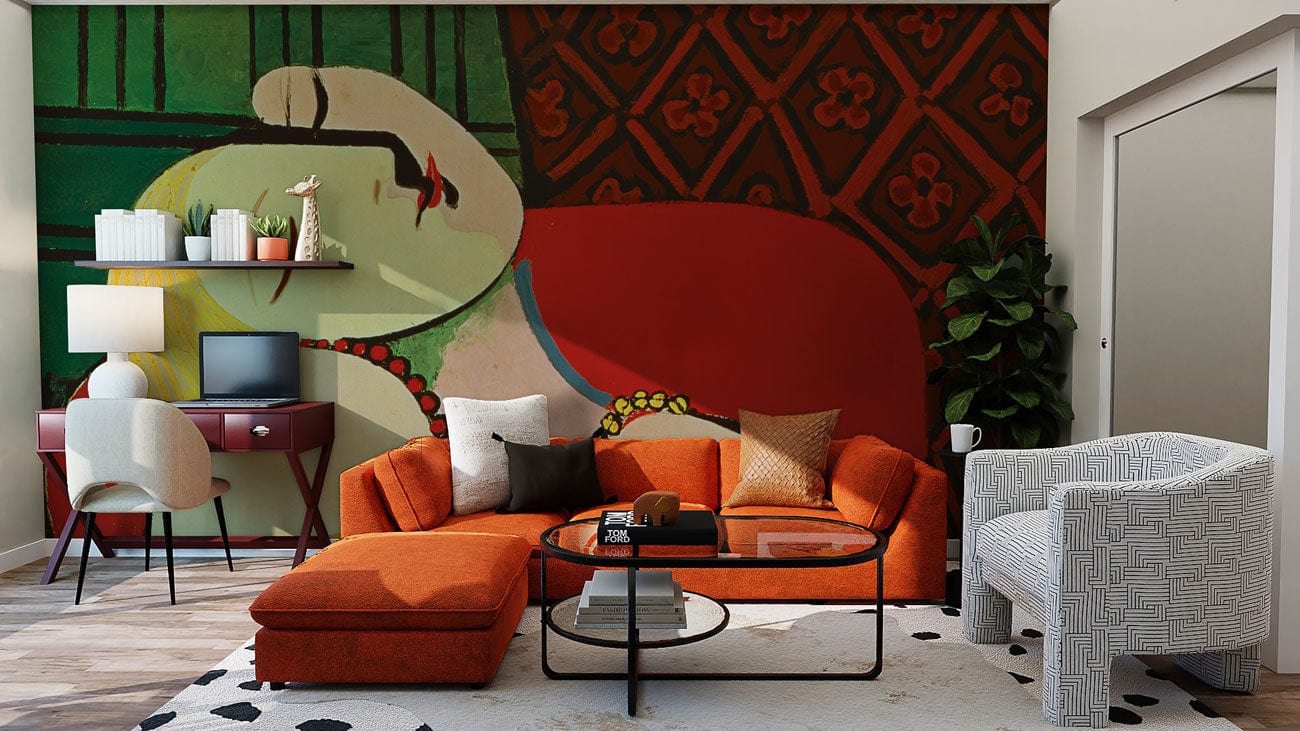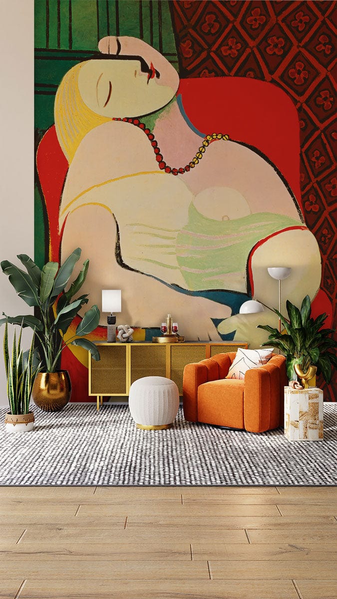 The Dream Wallpaper Mural offers a captivating portrayal of serene elegance, featuring a woman in repose with fluid lines and vibrant detail. This artwork is suffused with an aura of tranquillity, combining playful geometry with a warm palette. Perfect for creating a focal point, it effortlessly complements both classic and contemporary interiors, inviting a touch of artistic mastery into the heart of your home.