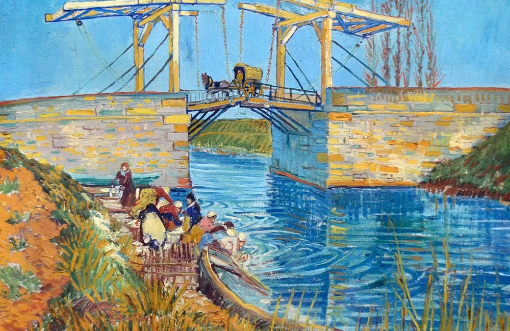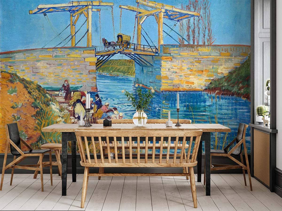 Live the dream. Live in the moment. Appreciate the beauty of the world with our Langlois Bridge Wallpaper Mural. An artistic representation of Van Gogh's painting of the same name, this mural is perfect to cover the empty wall space in your child's room, living room, home office, or any other place you would like to add colour and style. The wallpaper features a rippling blue river and a winding road, along with rich hues of green and blue. It has a trendy and classic look that makes it both stylish and versatile in any room.