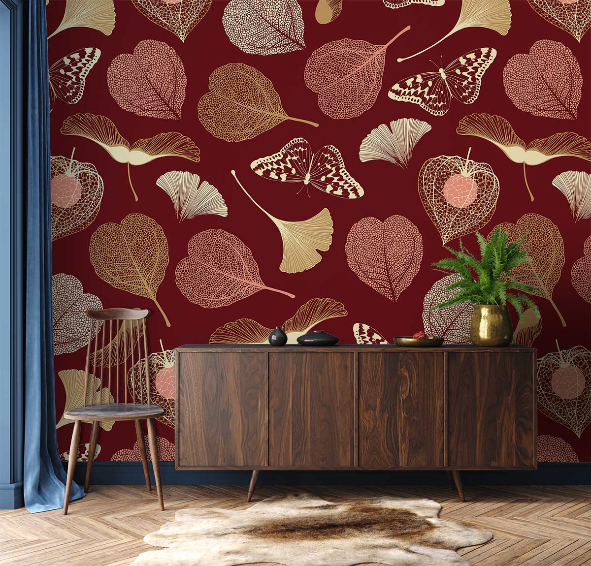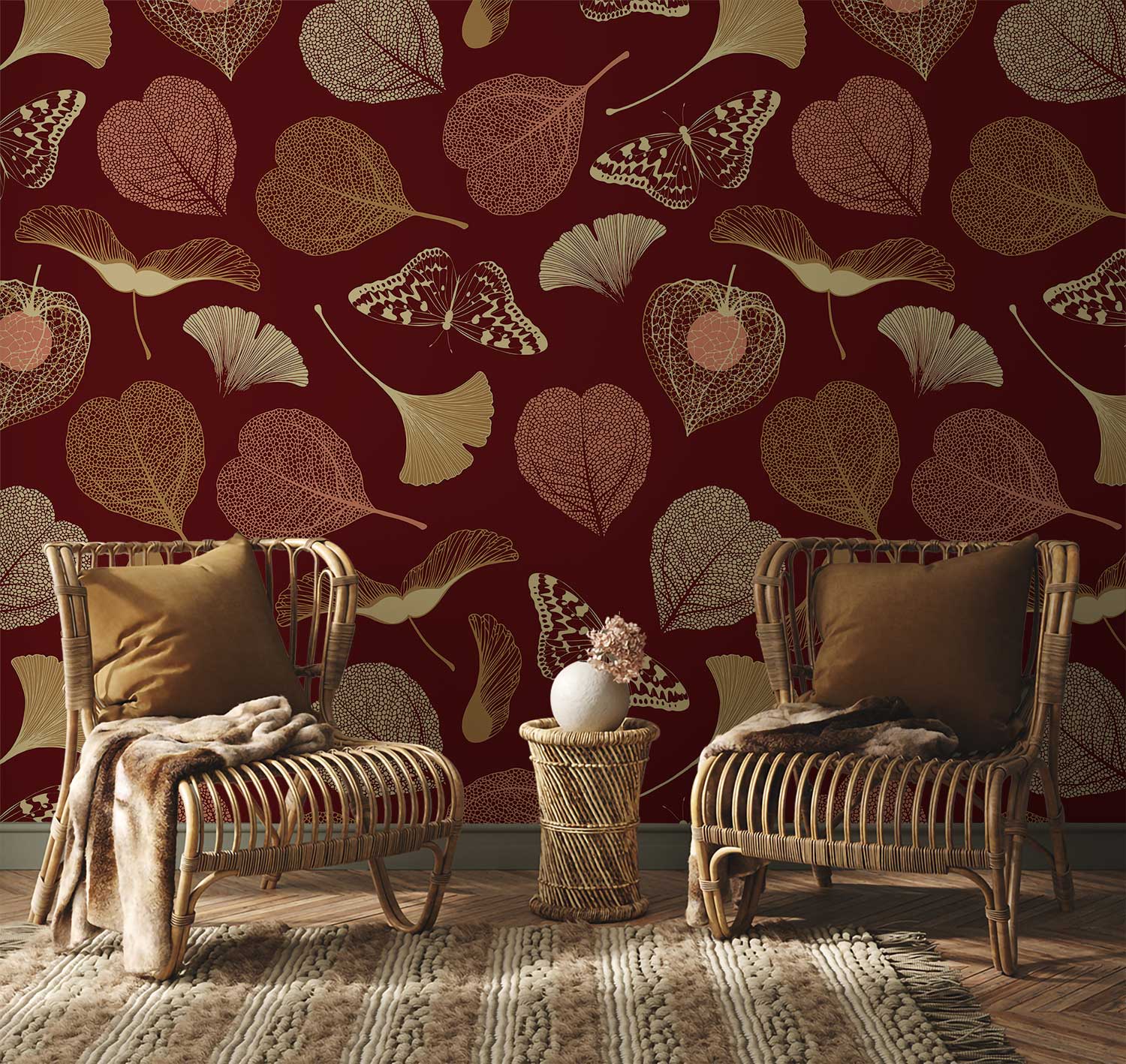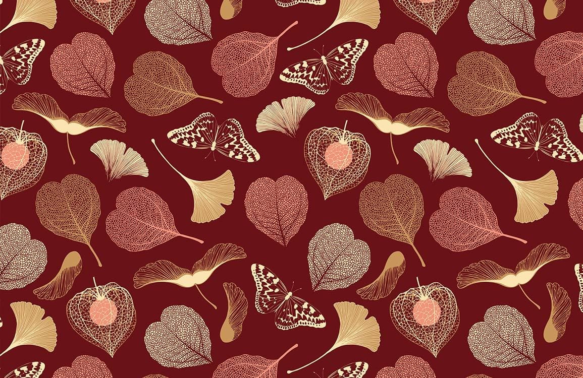 Imbue your space with the grace and intricacy of the Thin Leaves Wallpaper Mural. This design features delicate leaf motifs intertwined with elegant butterflies, creating a harmonious visual flow. Its sophisticated composition adds an air of timeless elegance, making it an exquisite choice for an array of settings.