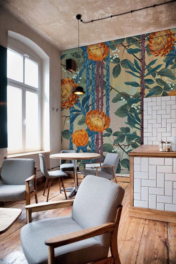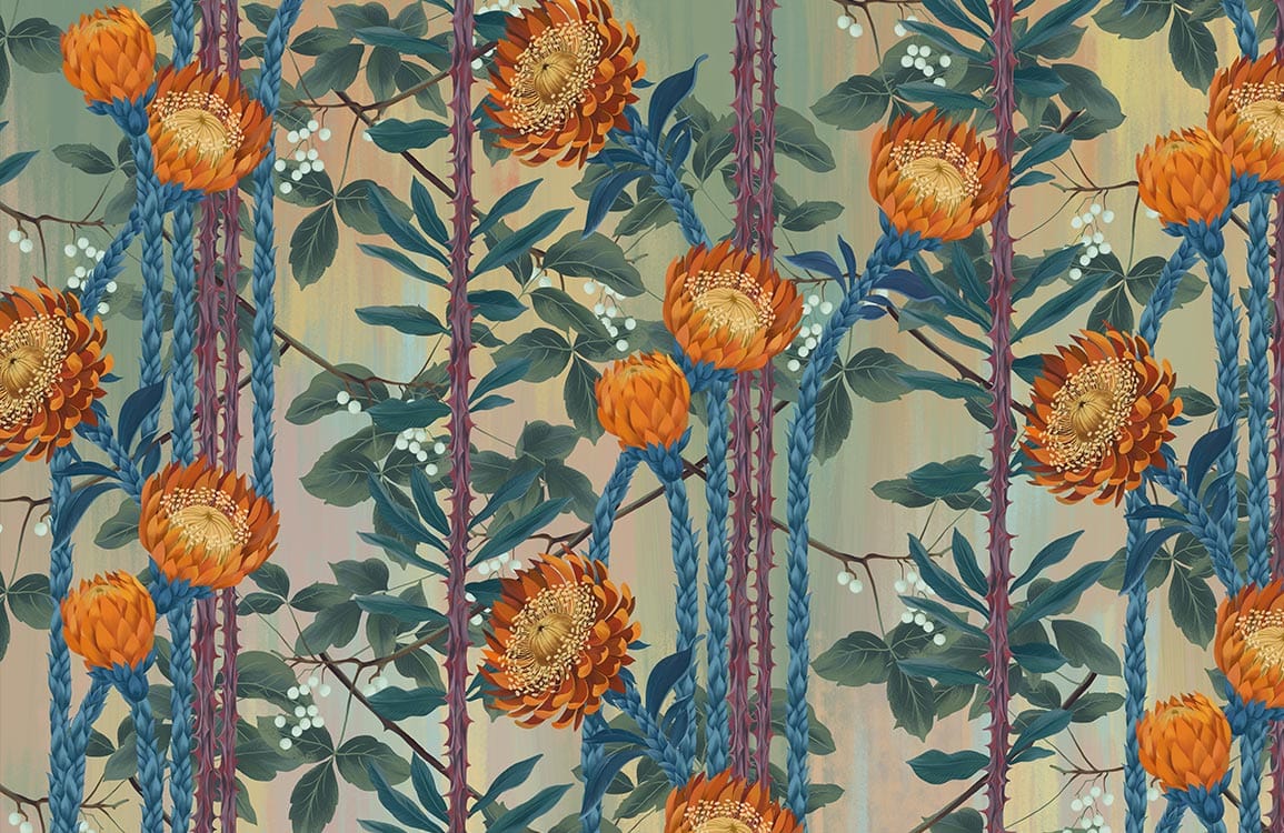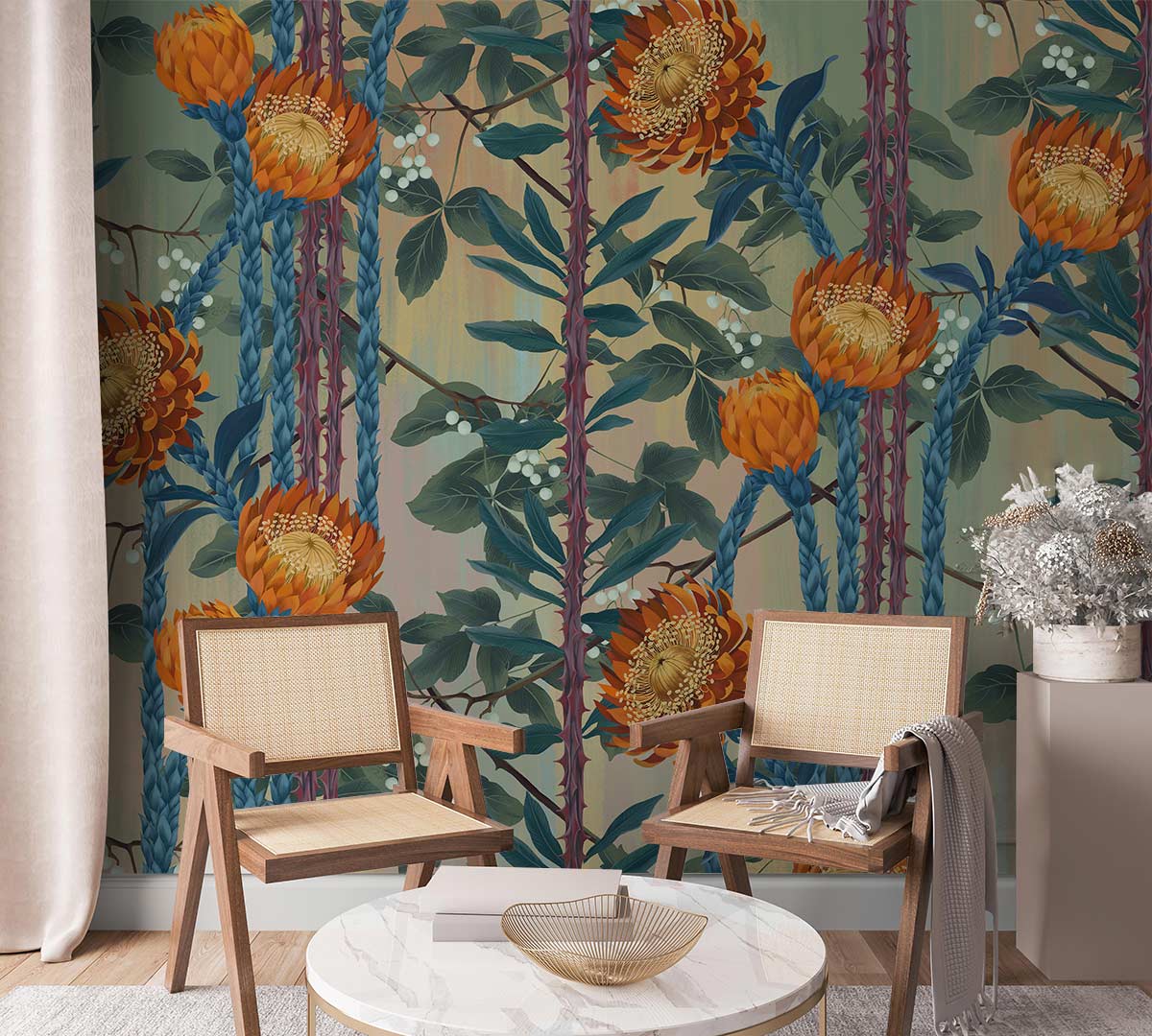 Immerse your space in the exquisite artistry of the Thorny Flowers lll Wallpaper Mural. With its luxurious tapestry of intricate floral blooms and delicate leafy vines, this mural creates a captivating visual narrative. The bold orange of the blossoms entwines with serene teal foliage, each element meticulously illustrated to evoke a sense of timeless elegance. Perfectly suited for both contemporary and classic interiors, this design offers a sophisticated backdrop that enriches any room with its refined charm and intricate details.