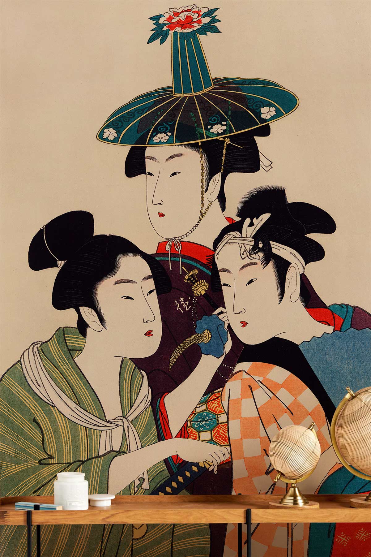 Enjoy this cool wallpaper mural for three Japanese young women who represent the original Japanese culture. This simple mural wallpaper is perfect if you are looking for the perfect decoration and look at your languages teaching council, or if your kids are fond of having a new style at their room this cool Japanese vibe mural is will fit nicely. These three young ladies will be a good company to your聽girls' room. Style it with modern wooden white furnishing and chiffon white curtains with black fluffy carpets.