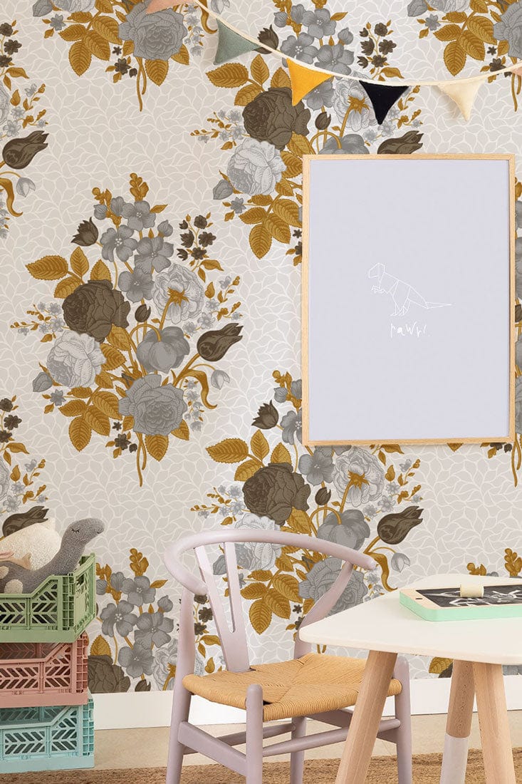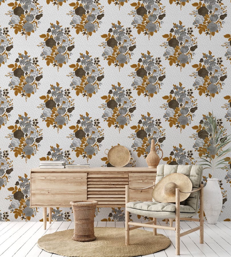 Discover the subtle charm of the Tiny Grey Bouquets Wallpaper Mural. Delicate floral motifs flourish across a gentle background, creating an intricate tapestry of elegance. These dainty, detailed bouquets of grey and muted mustard offer a timeless allure, effortlessly complementing both classic and contemporary interiors.