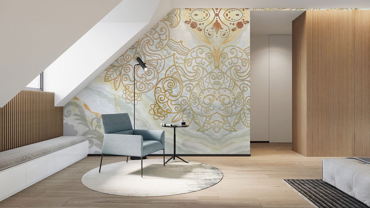 Totems Crystal Wallpaper Mural captivates with its intricate design, blending delicate swirls and ornate patterns reminiscent of timeless artistry. The subtle interplay of colours evokes an elegant and serene ambience, making it an exquisite choice for enriching interior atmospheres.