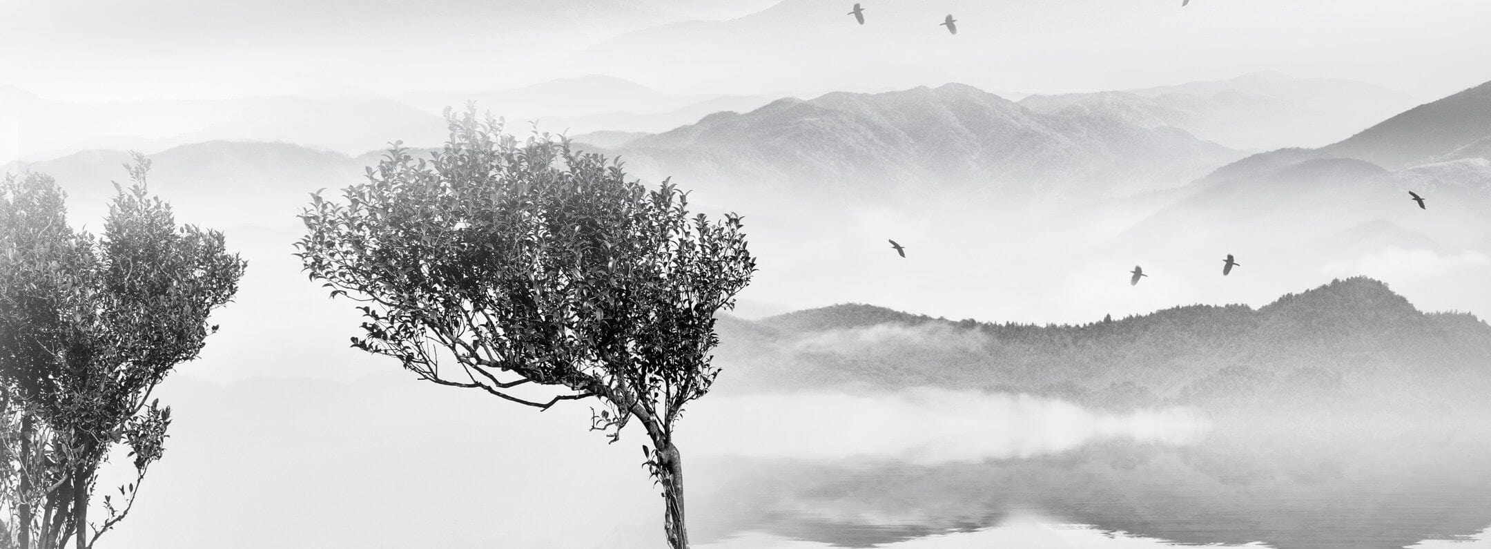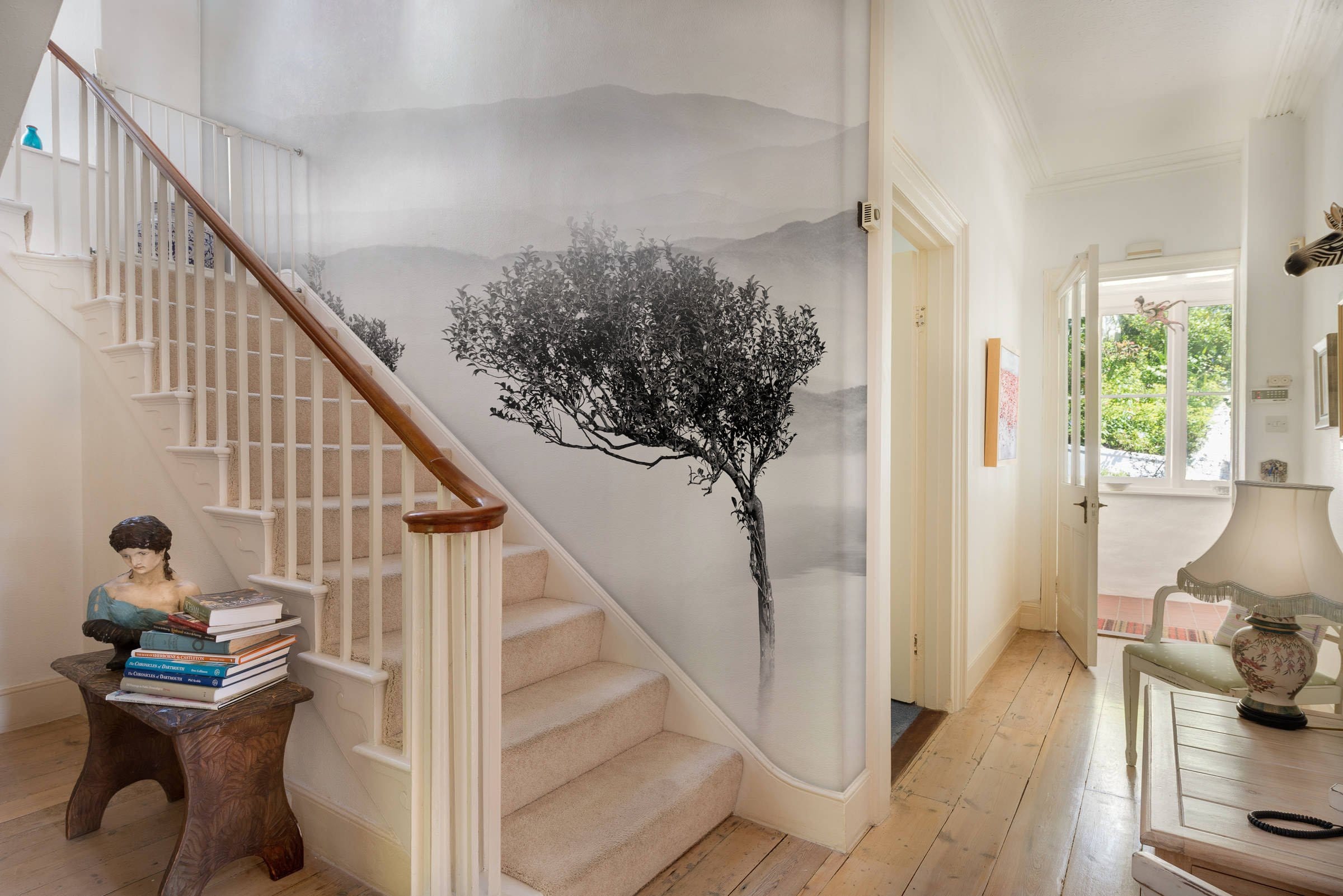 Immerse your space in the serene elegance of the Trees and Birds Wallpaper Mural. Featuring intricately detailed trees against a backdrop of ethereal mist, this design captures the tranquil beauty of nature. A subtle palette of monochrome shades evokes a timeless sophistication, making it a versatile addition to both classic and contemporary interiors. The artful depiction of birds in flight adds a dynamic element, infusing your room with a sense of peaceful movement and depth.