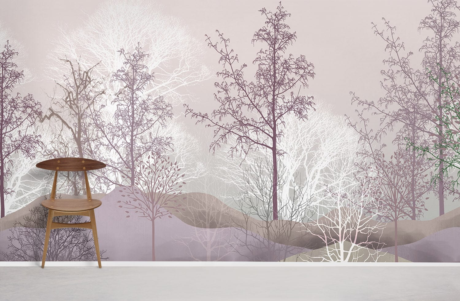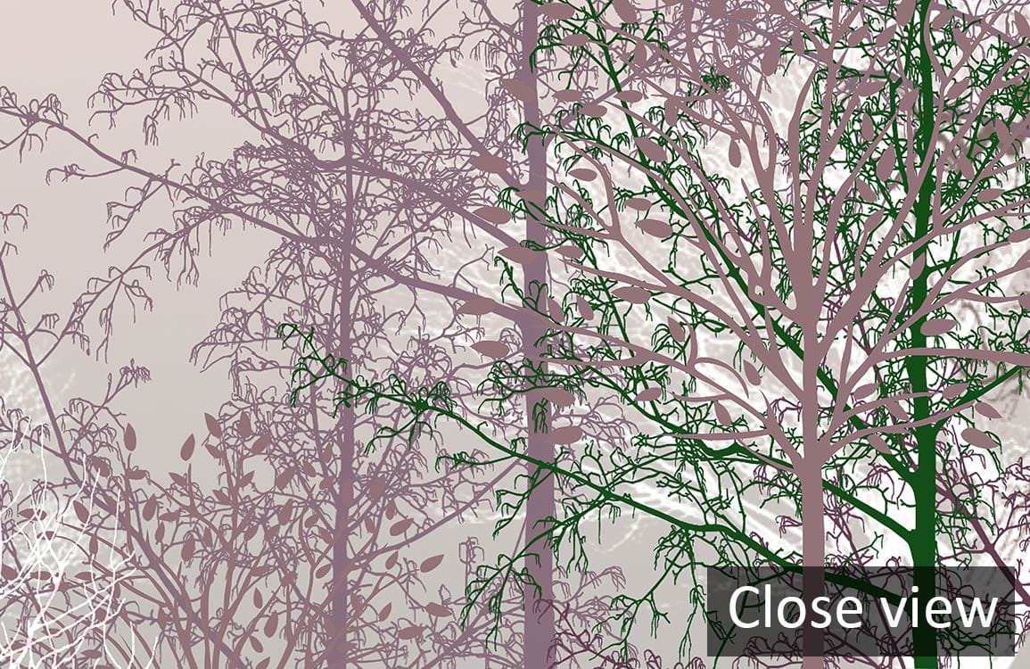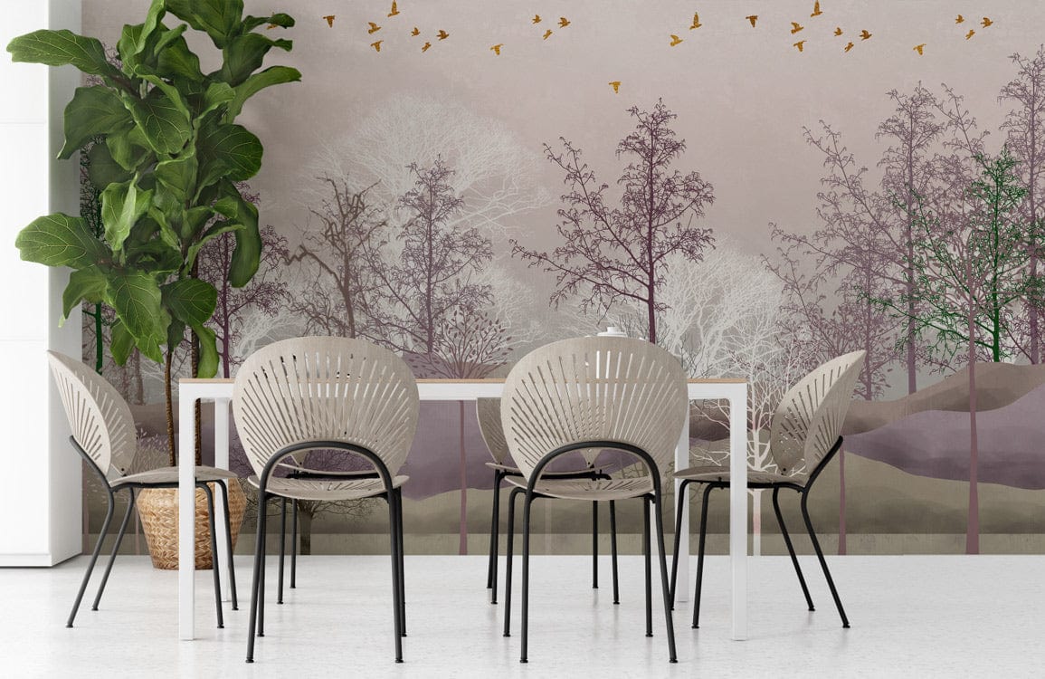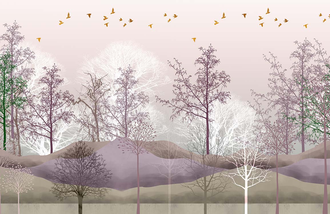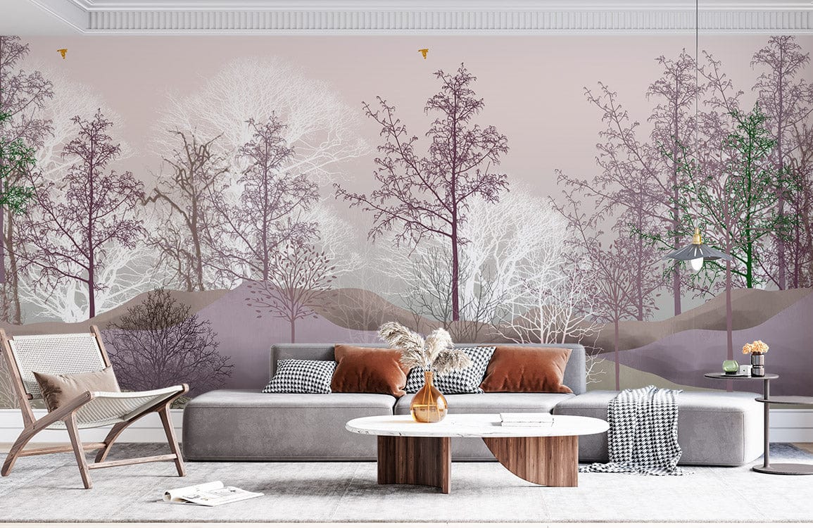 Immerse yourself in a serene woodland escape with the Trees Wallpaper Mural, where graceful silhouettes of trees stretch across a delicate landscape. Soft purples, muted greens, and gentle whites blend seamlessly to create an atmosphere of tranquil elegance. This mural captures the timeless allure of nature, making it an exquisite choice for both classic and contemporary interiors.