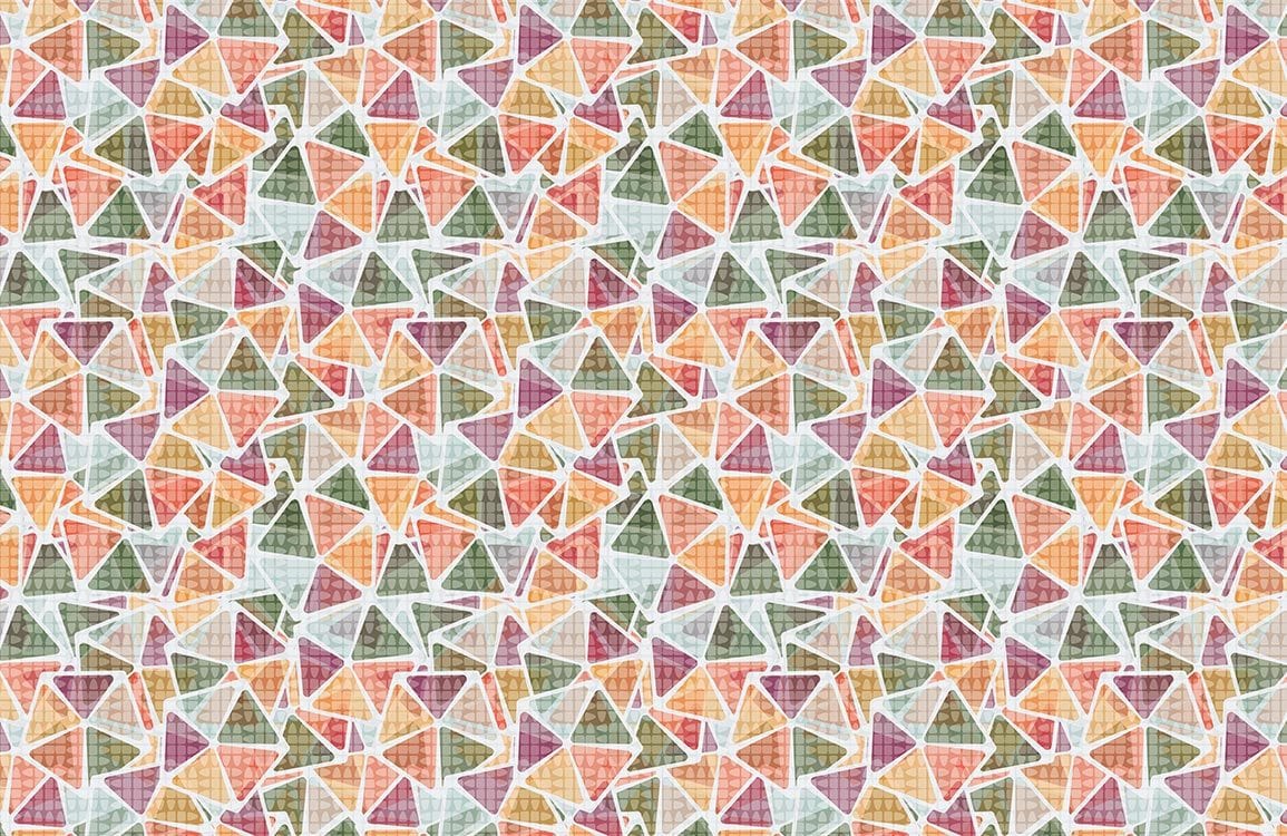 Delicate geometric patterns interlace to form a sophisticated tapestry of triangles that exude a refined elegance. The intricate design melds vibrant hues with subtle textures, inviting warmth and creating a serene atmosphere. This mural's timeless appeal seamlessly fits into a range of interior aesthetics, enhancing the visual harmony within any space.
