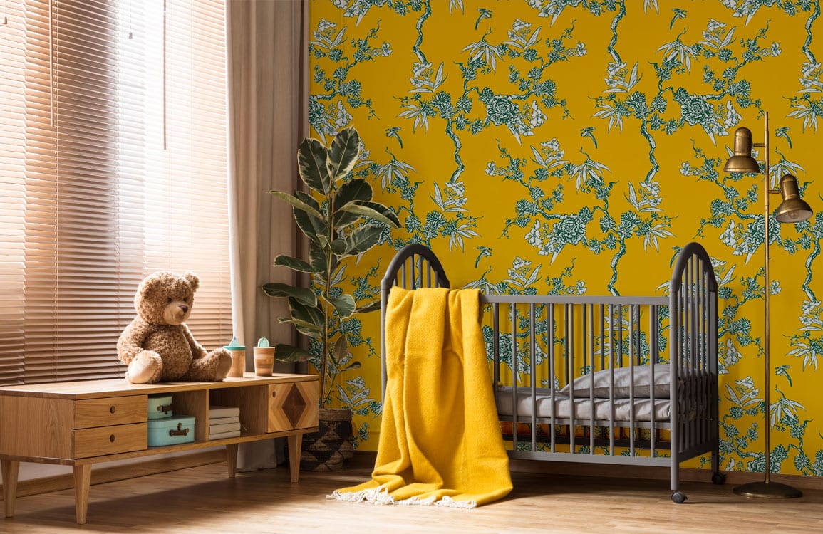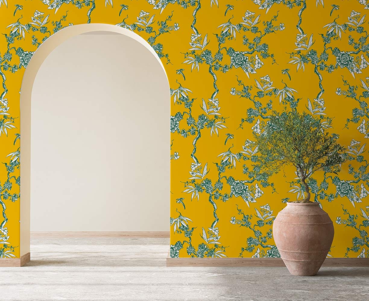 Immerse your space in the vibrant artistry of the Tropical Bloom Bliss Mural Wallpaper. This design showcases luxuriant floral patterns, intertwining with subtle natural elements, gracefully set against a rich ochre backdrop. The intricate detailing and textural finesse are perfect for adding depth and sophistication to any interior setting. Its timeless appeal makes it an ideal choice for those seeking elegance and charm.