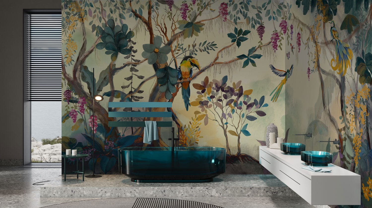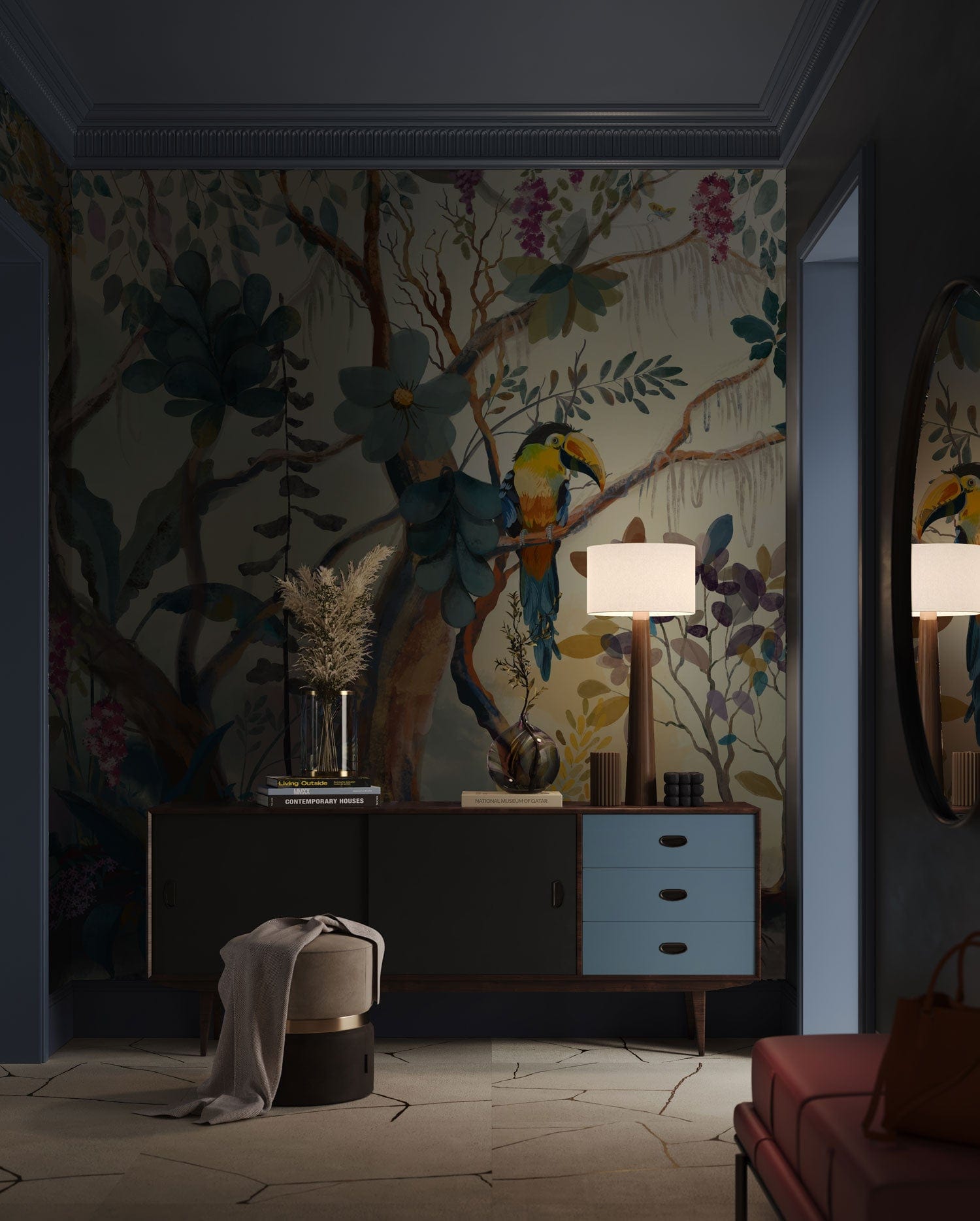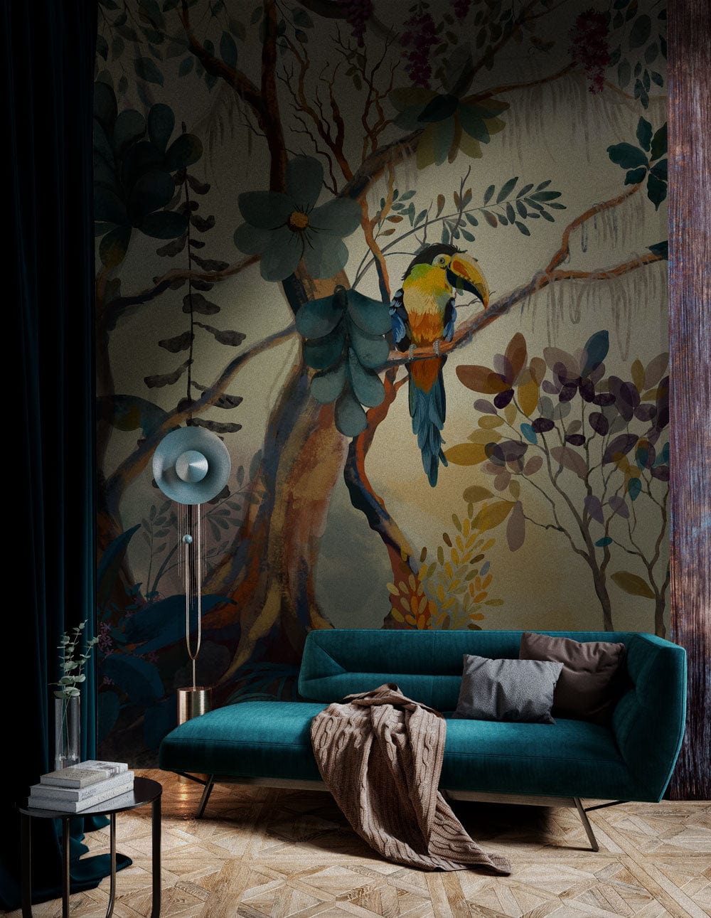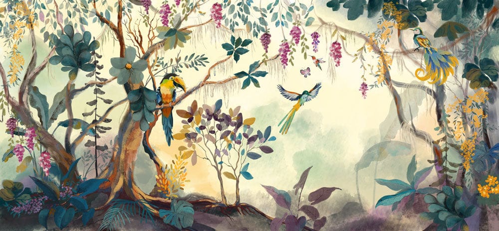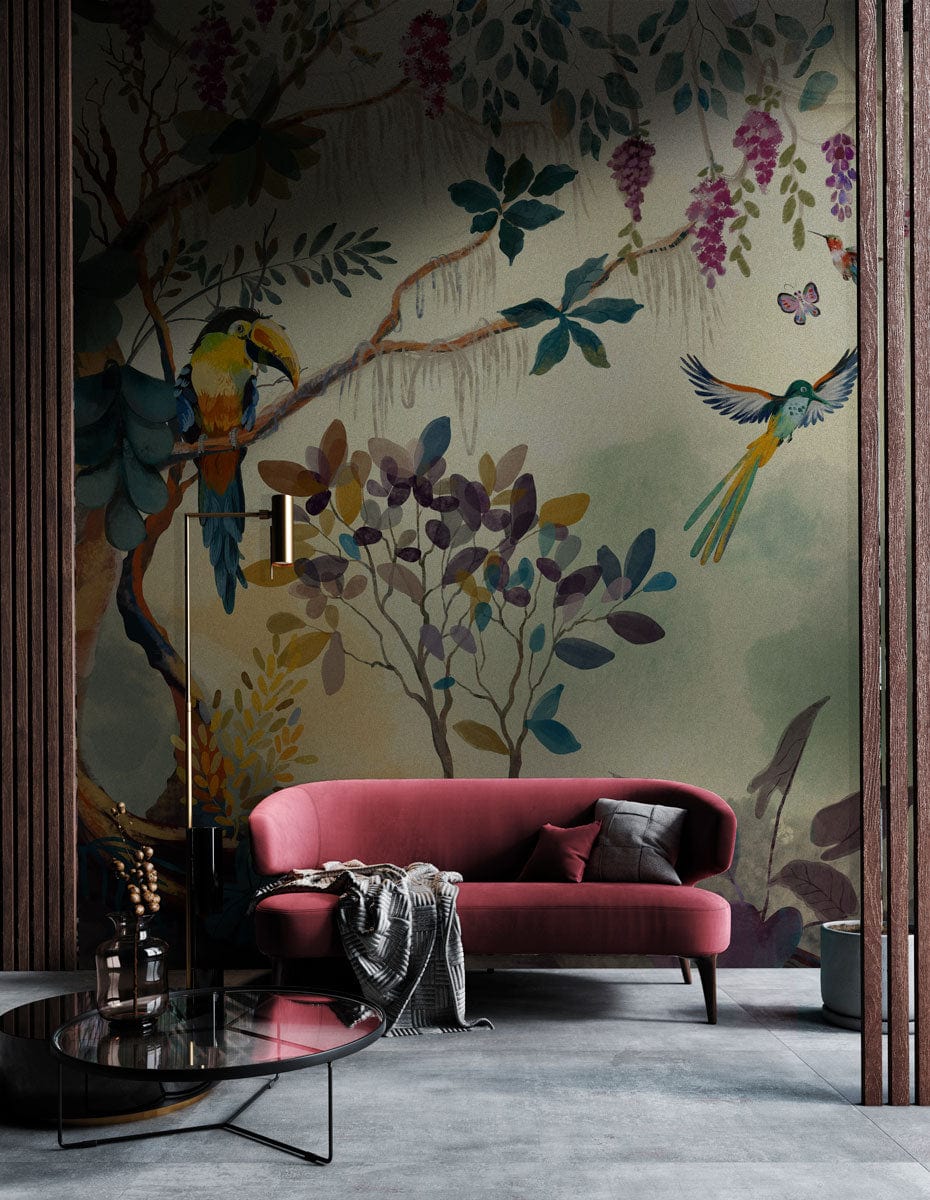 Immerse your space in a lush tapestry of vibrant flora and exotic birds with this Tropical Jungle Birds Mural Wallpaper. Intricate details capture a scene rich with life, featuring graceful parrots amidst verdant foliage and cascading blossoms that evoke a timeless elegance. Perfect for creating a sophisticated atmosphere in varied interior settings, this mural brings the beauty of the tropics indoors, offering a unique artistic statement.