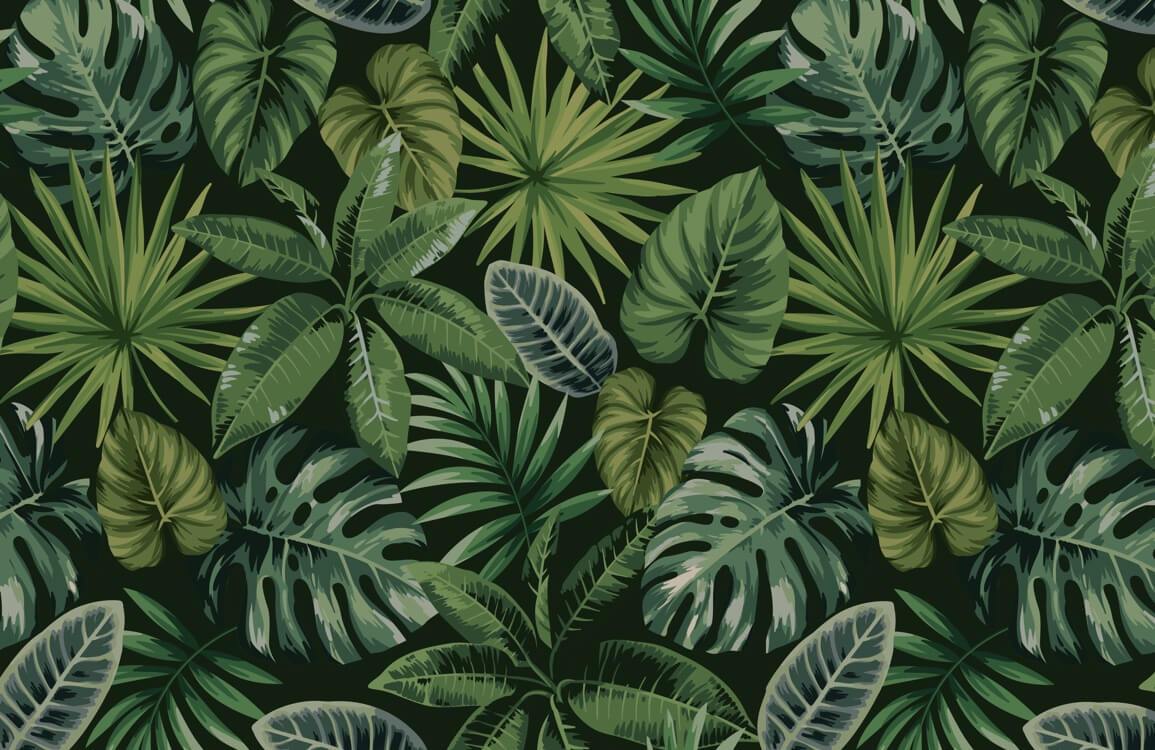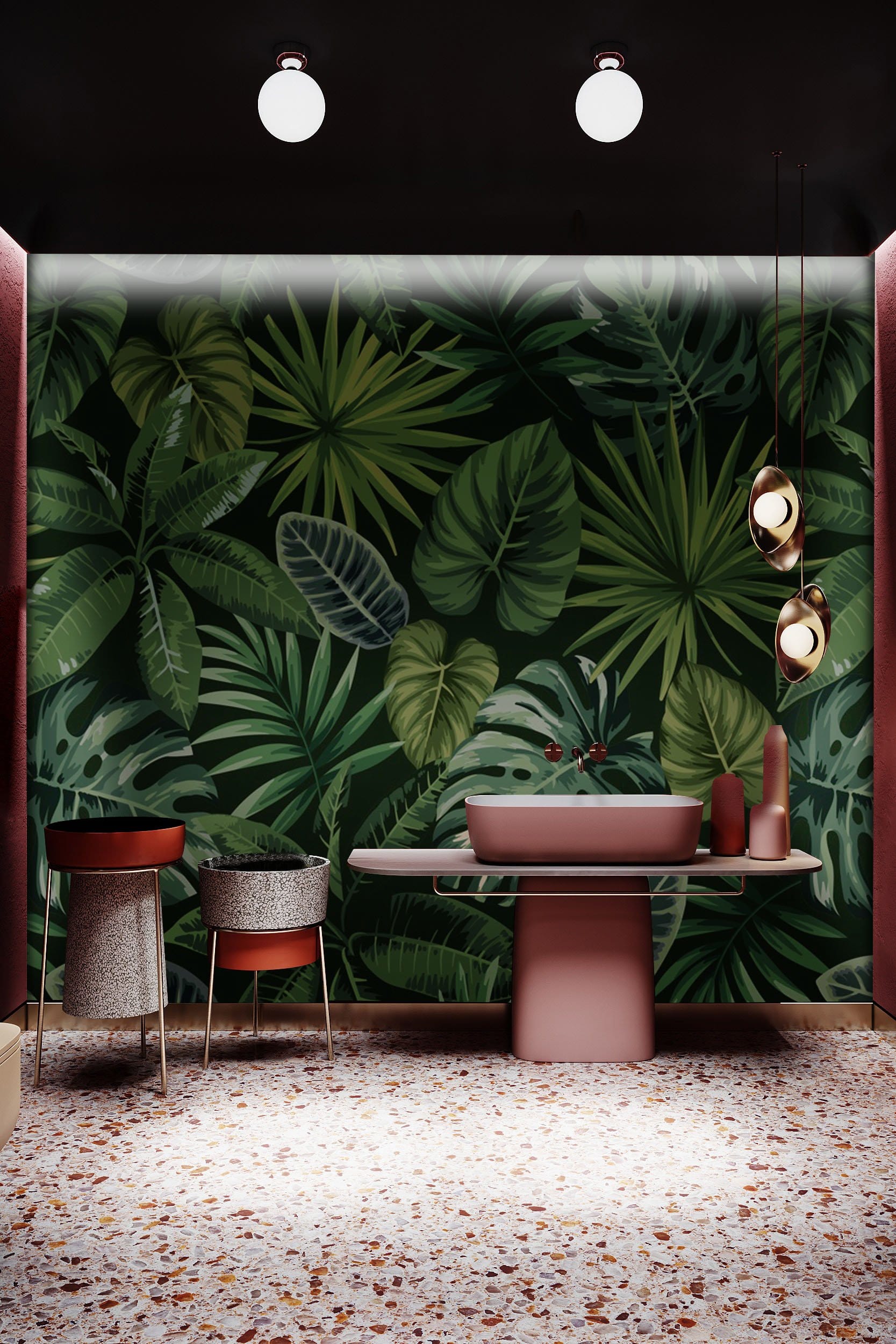 Bring tropical forest close to you with this green leaf wallpaper mural. These fresh green tropical leaves against the dark background make a rather dramatic print and will surely make a nature and stylish statement in your home. This stunning green wallpaper will look amazing in your living room, bedroom or dining hall.