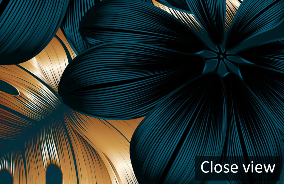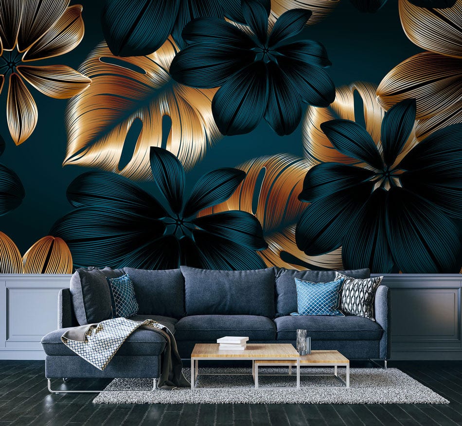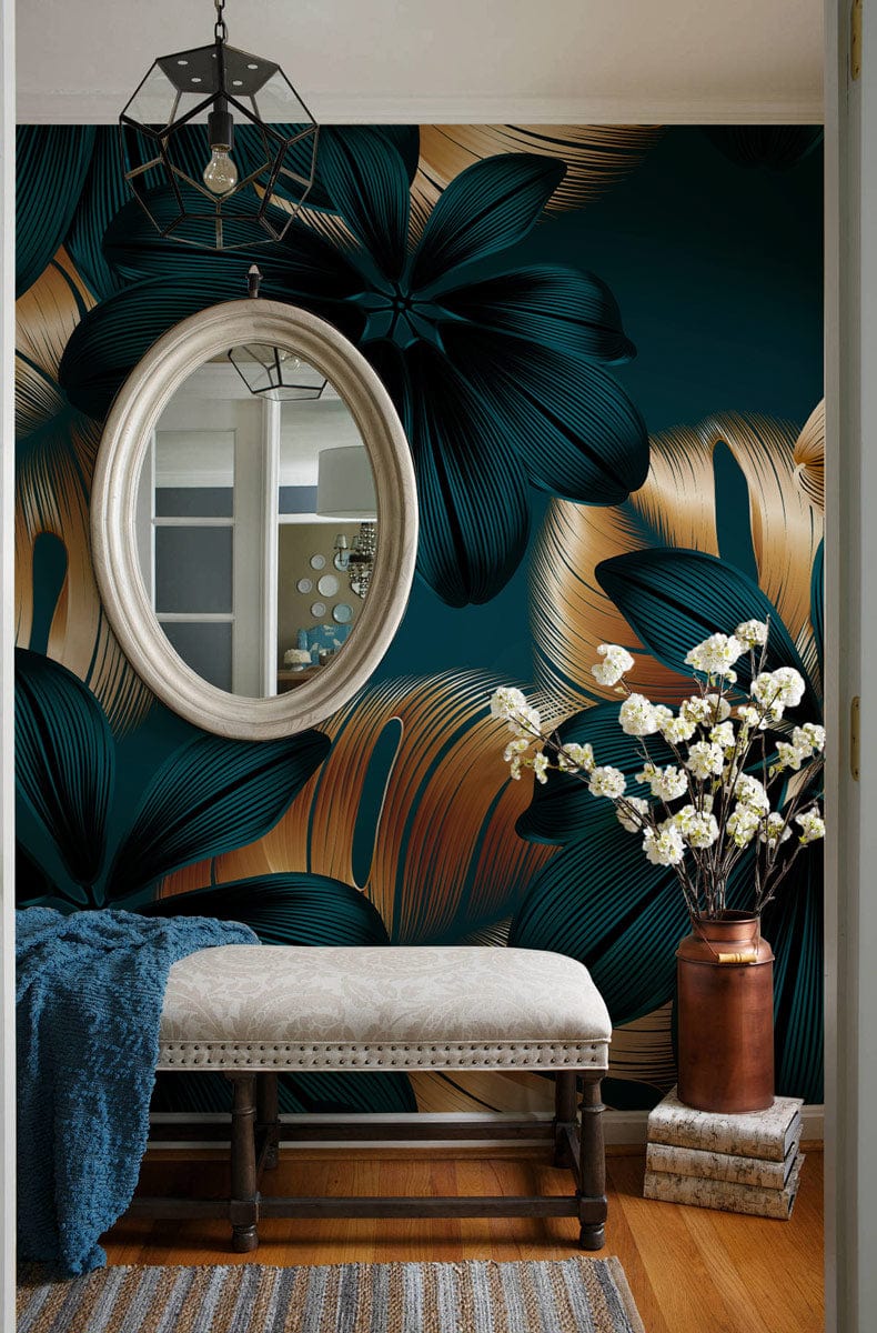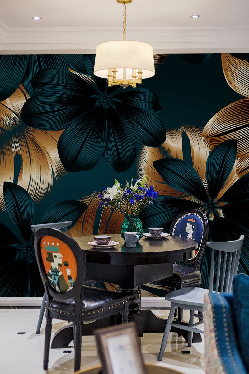 Experience the allure of the tropics with the Tropical Luxe Elegance Mural Wallpaper. Its intricate design features lush foliage in deep teal and opulent gold tones, creating a striking visual presence. The artistic detailing offers a rich texture that captivates the senses, making it a perfect fit for sophisticated interiors. This wallpaper adds an essence of timeless luxury to living rooms, bedrooms, or study spaces.