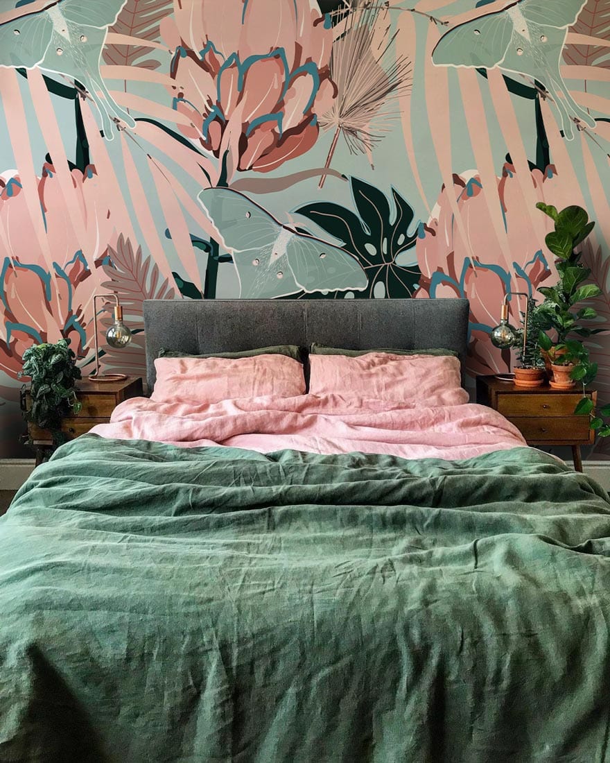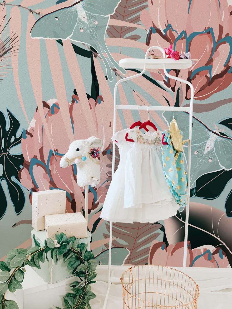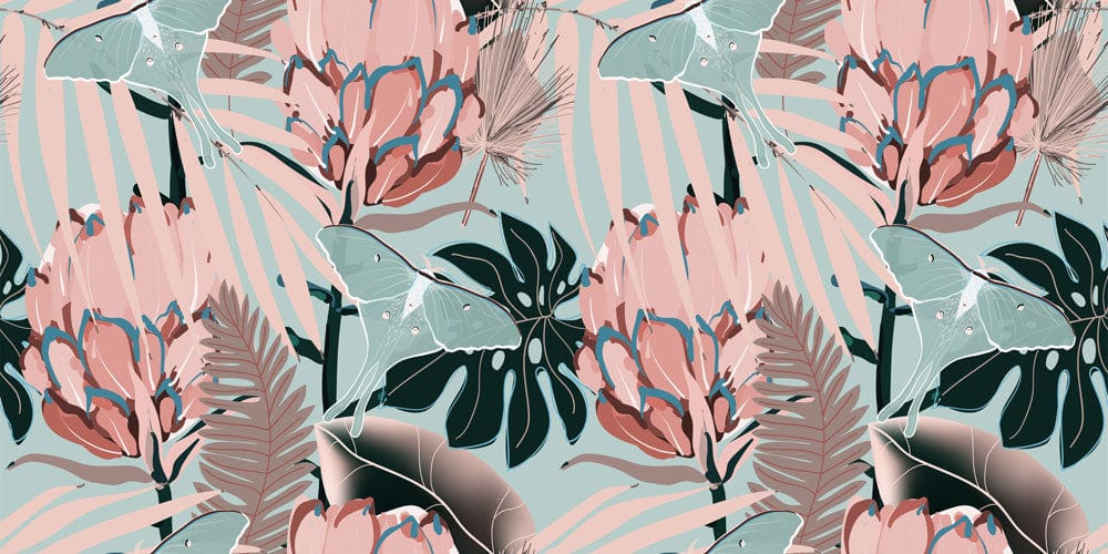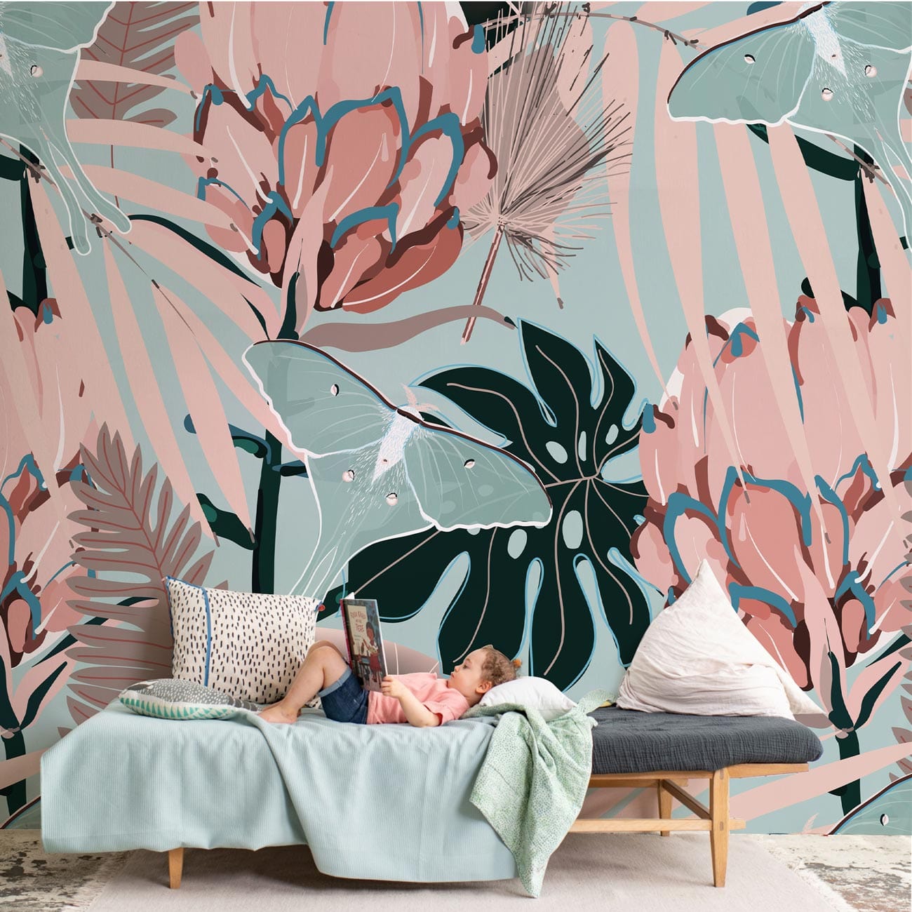 Immerse yourself in the captivating allure of nature with this Tropical Moths and Botanical Bliss mural wallpaper. Delicate moths flutter amidst lush, oversized tropical foliage and elegant florals, creating a serene and picturesque landscape. The sophisticated blend of colours and exquisite detailing invites a sense of tranquillity and depth, seamlessly complementing both classic and contemporary decor styles.