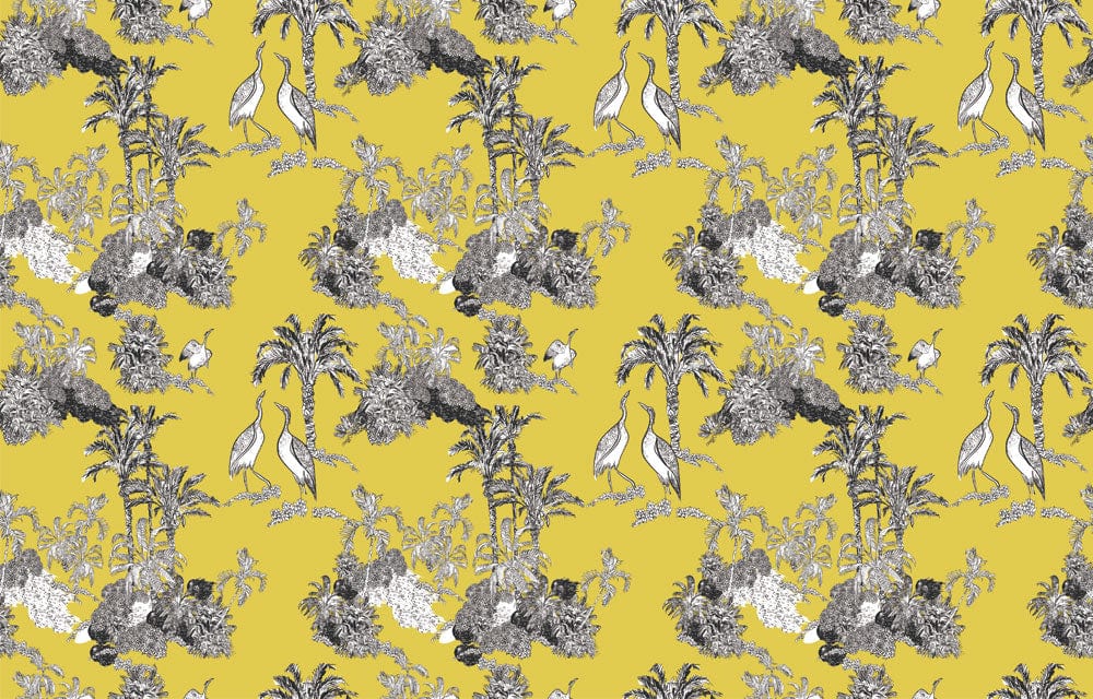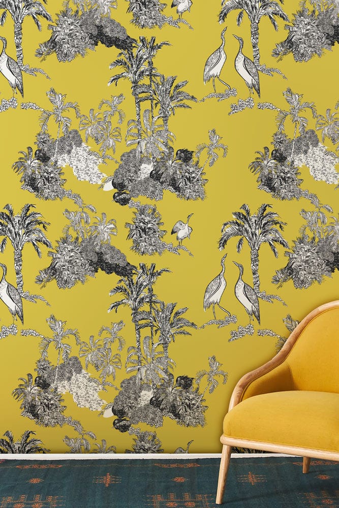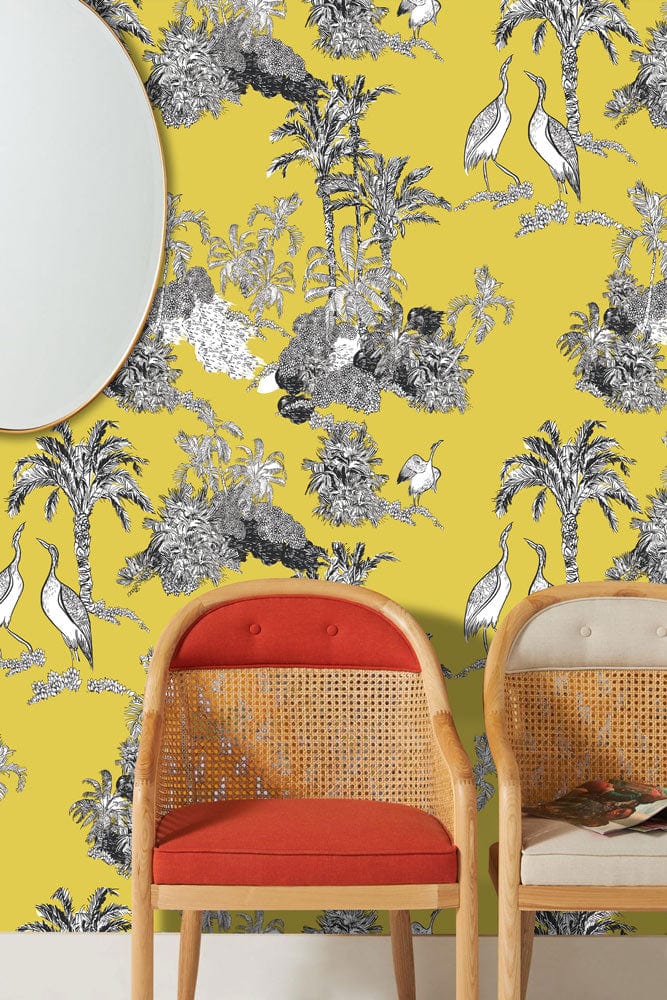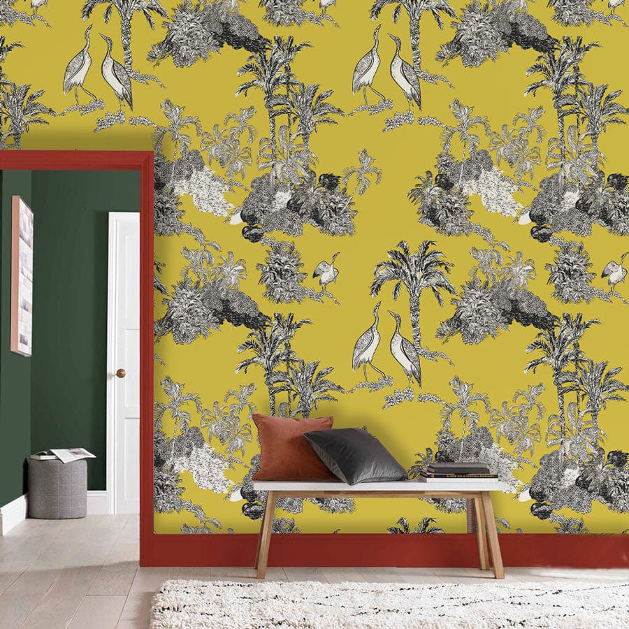Experience the allure of a verdant escape with the Tropical Paradise Retreat Mural Wallpaper. Exquisitely detailed with lush foliage and elegant avian silhouettes, this mural captivates with its intricate artistry and bold yellow backdrop. Perfectly suited for a sophisticated touch in diverse interior spaces, the design blends traditional charm with contemporary flair.