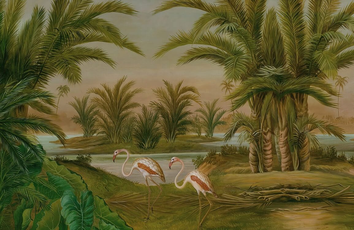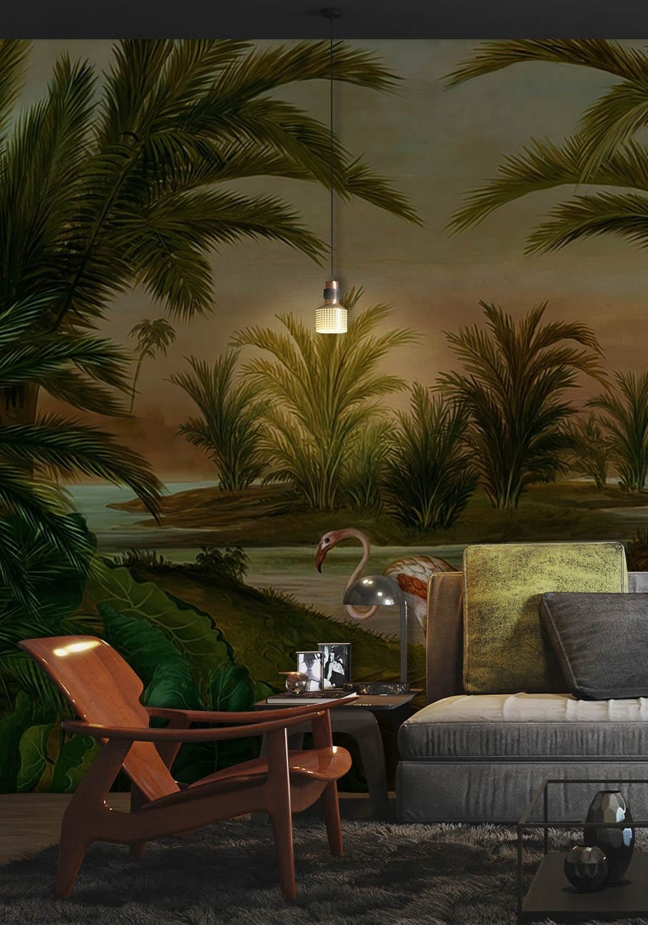 Escape into the tropical paradise with this attractive wallpaper mural. This jungle-themed wall mural shows tropical palm trees with flamingos alongside that surely gives your room a fresh appeal. Ideal wallpaper for your living room, bedroom and dining hall. Pair it with modern furniture and home decors to feel the passion of tropical forest.
